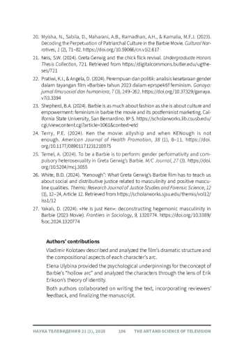 20. Myisha, N., Sabila, D., Maharani, A.B., Ramadhan, A.H., & Kamalia, M.F.J. (2023). Decoding the Perpetuation of Patriarchal Culture in the Barbie Movie. Cultural Narratives, 1 (2), 71-82. DOI: 10.59066/cn.v1i2.617 EDN: QIBZPA