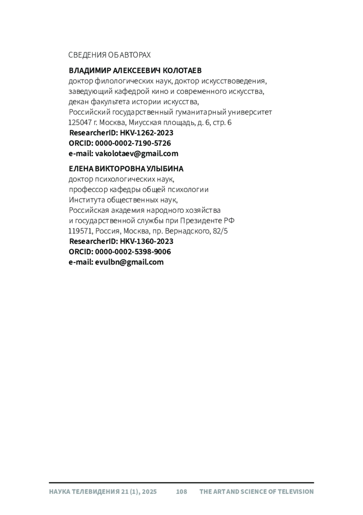 Публикация интервью сотрудников ГИТРа с известным режиссером Алексеем Германом-младшим связана с выявлением критериев успеха в современном кинотворчестве. Эта проблема раскрывается через рассмотрение многих вопросов: отношение к новому, в том числе к неизбежной интенсификации технологизации; осмысление разных киножанров, прежде всего фантастики, как маркера новаторства на экране; искусственный интеллект в сравнении с творчеством живых художников; наследие кинематографического прошлого и место отечественного кино в мировом масштабе; финансирование киноиндустрии в России и США. Изучая художественную практику современной киноиндустрии в сравнении с более ранними этапами ее эволюции, авторы делают попытку сформировать прогностический взгляд на развитие кинематографа, прежде всего, отечественного.