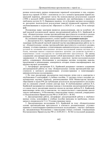 В диссертационном совете 24.2.320.07, созданном на базе Федерального государственного бюджетного образовательного учреждения высшего образования «Кубанский государственный университет» 10 октября 2024 года заведующий кафедрой «Уголовное право и процесс» Севастопольского государственного университета Н. А. Крайнова успешно защитила диссертацию на соискание ученой степени доктора юридических наук (специальность 5.1.4. Уголовно-правовые науки) на тему: «Концептуальные основы противодействия преступности в контексте ресоциализации: уголовно-правовое и пенитенциарно-криминологическое исследование». Статья написана на основе отзыва одного из официальных оппонентов на диссертацию Н. А. Крайновой.