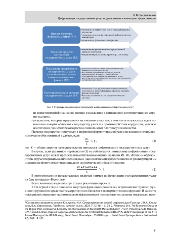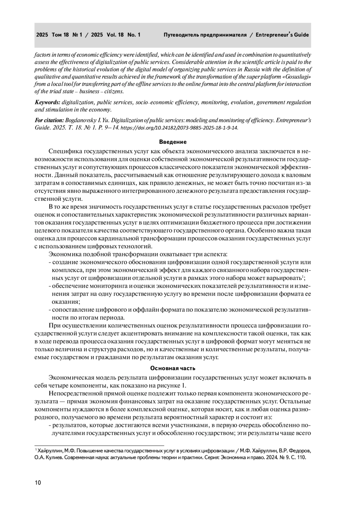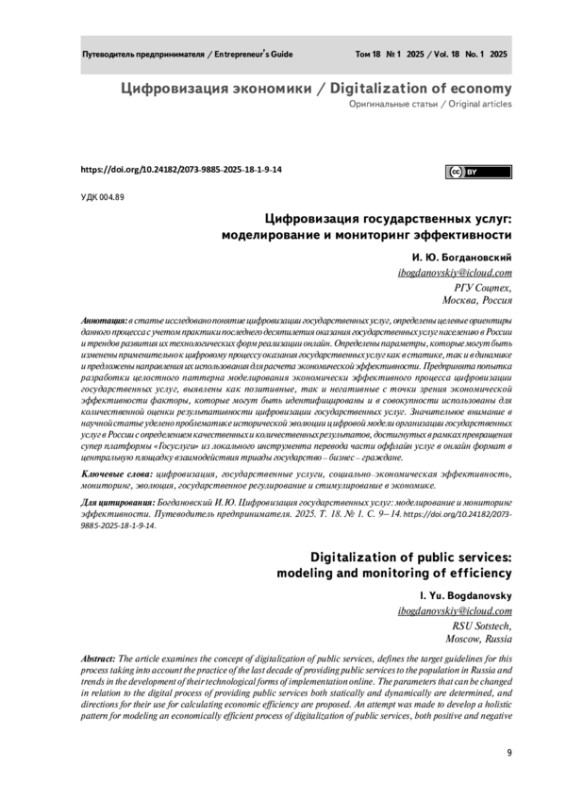 В статье исследовано понятие цифровизации государственных услуг, определены целевые ориентиры данного процесса с учетом практики последнего десятилетия оказания государственных услуг населению в России и трендов развития их технологических форм реализации онлайн. Определены параметры, которые могут быть изменены применительно к цифровому процессу оказания государственных услуг как в статике, так и в динамике и предложены направления их использования для расчета экономической эффективности. Предпринята попытка разработки целостного паттерна моделирования экономически эффективного процесса цифровизации государственных услуг, выявлены как позитивные, так и негативные с точки зрения экономической эффективности факторы, которые могут быть идентифицированы и в совокупности использованы для количественной оценки результативности цифровизации государственных услуг. Значительное внимание в научной статье уделено проблематике исторической эволюции цифровой модели организации государственных услуг в России с определением качественных и количественных результатов, достигнутых в рамках превращения супер платформы «Госуслуги» из локального инструмента перевода части оффлайн услуг в онлайн формат в центральную площадку взаимодействия триады государство – бизнес – граждане.