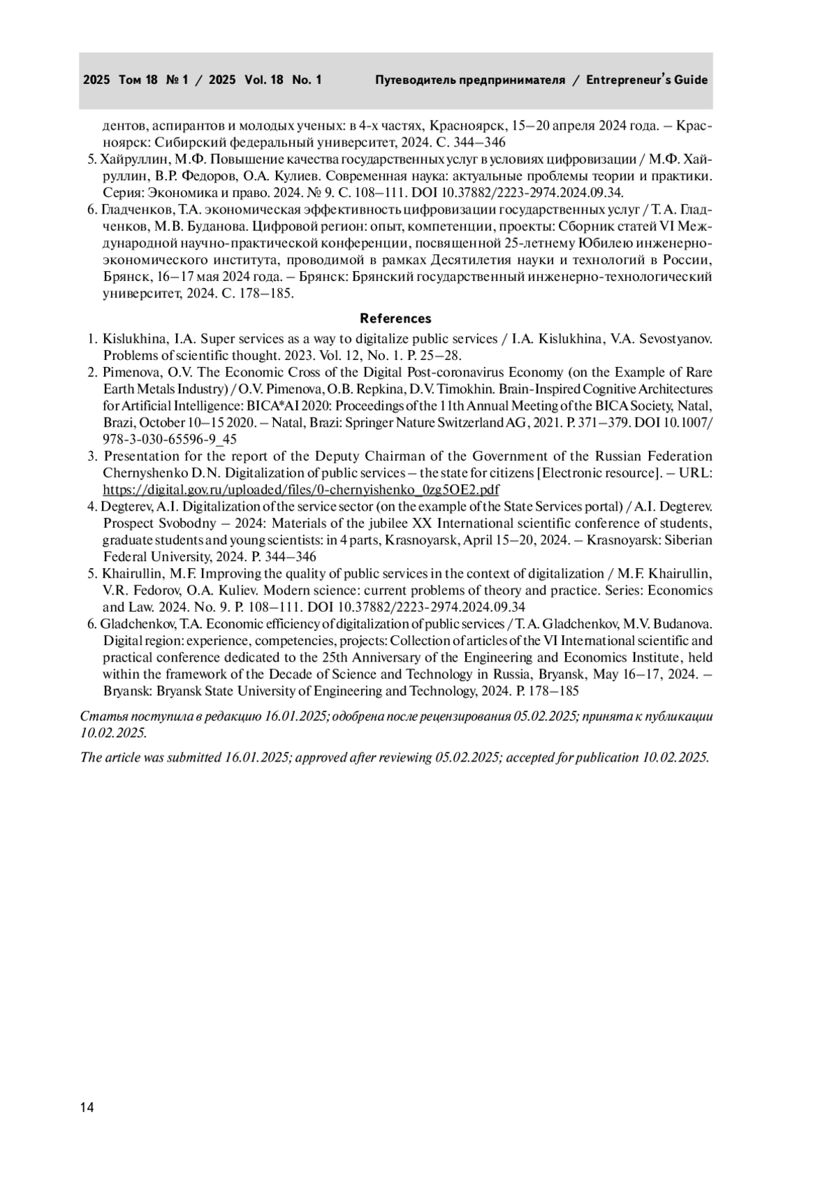 5. Хайруллин, М.Ф. Повышение качества государственных услуг в условиях цифровизации / М.Ф. Хайруллин, В.Р. Федоров, О.А. Кулиев. Современная наука: актуальные проблемы теории и практики. Серия: Экономика и право. 2024. № 9. С. 108-111. https://doi.org/10.37882/2223-2974.2024.09.34.