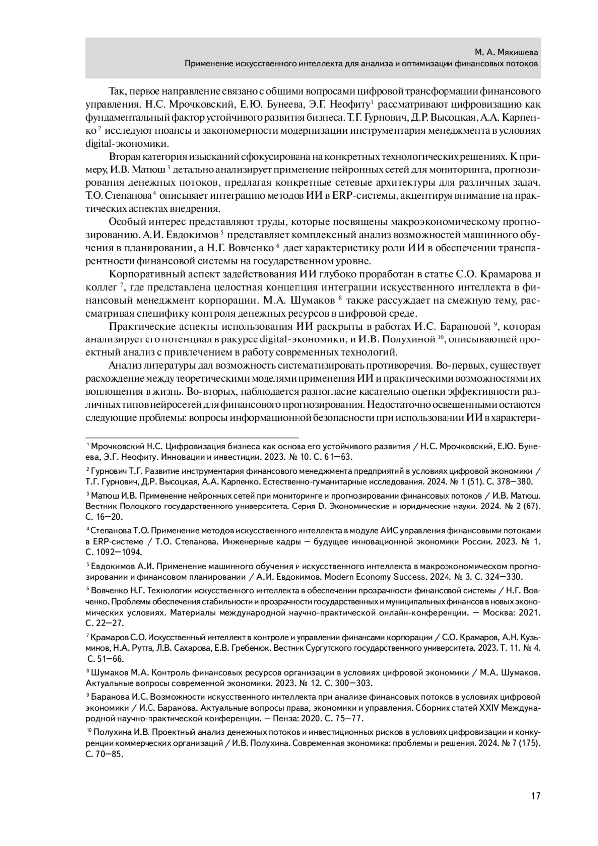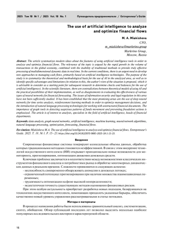 В статье систематизированы современные представления об особенностях использования инструментария искусственного интеллекта в целях анализа, оптимизации финансовых потоков. Актуальность темы аргументируется стремительным ростом объема транзакций в глобальной экономике в сочетании с неспособностью традиционных методов обеспечить по–настоящему результативную обработку многомерных динамических данных в режиме реального времени. В нынешних условиях возникает острая необходимость в разработке новых подходов к управлению денежными потоками — прежде всего, построенных на основе технологий искусственного интеллекта. Цель исследования заключается в систематизации теоретико–методологического базиса применения ИИ в анализируемой сфере, а также в выявлении конкретных преимуществ и ограничений (в отношении этого предложен авторский взгляд на ситуацию, который целесообразно рассматривать в качестве отправной точки для последующих изысканий на предмет определения сдержек и противовесов к задействованию искусственного интеллекта). В научной литературе наблюдаются противоречия между теоретическими моделями использования ИИ и практическими возможностями их реализации, а также разногласия в оценках эффективности различных типов нейросетей для финансового прогнозирования. Недостаточно исследованы вопросы информационной безопасности, правового регулирования в данной области. Установлено, что наиболее перспективными направлениями являются применение глубоких нейронных сетей для анализа временных рядов, методов обучения с подкреплением в целях оптимизации управленческих решений, внедрение технологий обработки естественного языка для работы с неструктурированными финансовыми документами. Подчеркнута значимость графовых инструментов в обнаружении подозрительных схем движения средств, предотвращении мошеннических действий. Статья представляет интерес для аналитиков, специалистов в области искусственного интеллекта, руководителей финансовых департаментов.