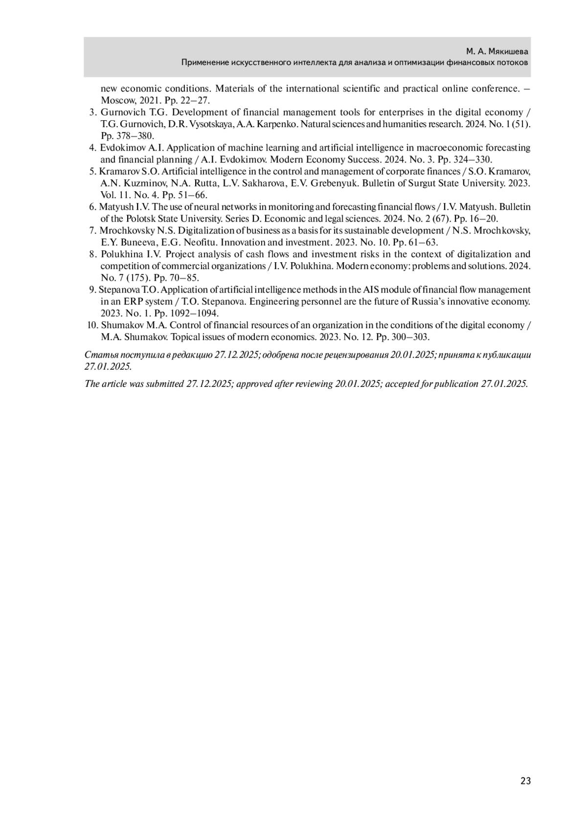 5. Крамаров С.О. Искусственный интеллект в контроле и управлении финансами корпорации / С.О. Крамаров, А.Н. Кузьминов, Н.А. Рутта, Л.В. Сахарова, Е.В. Гребенюк. Вестник Сургутского государственного университета. 2023. Т. 11. № 4. С. 51-66.