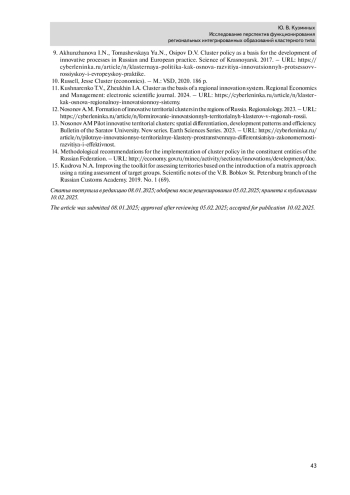 12. Носонов А.М. Формирование инновационных территориальных кластеров в регионах России. Регионология. 2023. - URL: https://cyberleninka.ru/article/n/formirovanie-innovatsionnyh-territorialnyh-klasterov-v-regionah-rossii.