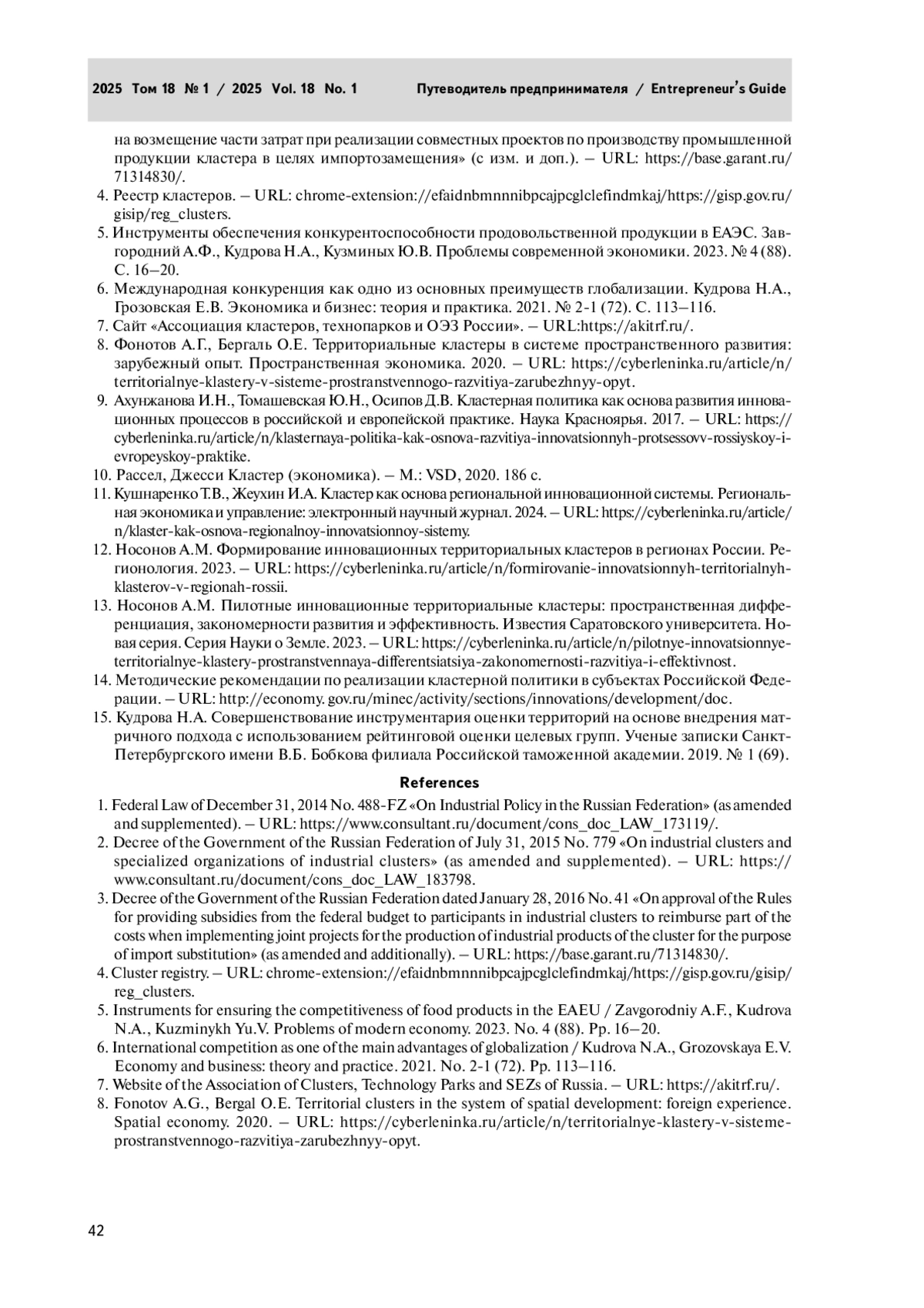 8. Фонотов А.Г., Бергаль О.Е. Территориальные кластеры в системе пространственного развития: зарубежный опыт. Пространственная экономика. 2020. - URL: https://cyberleninka.ru/article/n/territorialnye-klastery-v-sisteme-prostranstvennogo-razvitiya-zarubezhnyy-opyt.