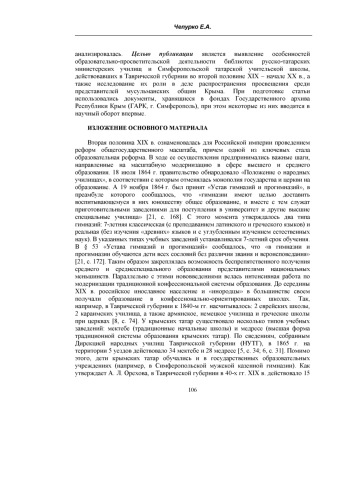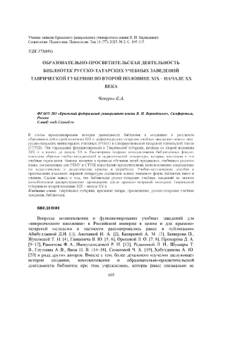 В статье проанализирована история деятельности библиотек в созданных в результате образовательной второй половины XIX в. реформы русско-татарских учебных заведениях нового типа: русско-татарских министерских училищах (РТМУ) и Симферопольской татарской учительской школе (СТУШ). Эти учреждения функционировали в Таврической губернии, начиная со второй половины XIX в. и вплоть до начала XX в. Рассмотрены вопросы комплектования библиотечных фондов, выявлены образцы учебно-методической и педагогической литературы, которые поступали в эти учебные учреждения. Важное значение в процессе обучения детей придавалось учебникам русского языка, составленным для РТМУ и СТУШ известными просветителями, использовавших современные им педагогические и дидактические приемы и разработки. Учебно-методические пособия и произведения классиков мировой литературы составляли основу книжного фонда библиотек школ и училищ. Сделан вывод о том, что библиотеки русско-татарских учебных заведений во многом способствовали распространению просвещения среди крымско-татарской молодежи Таврической губернии во второй половине XIX - начале XX в.