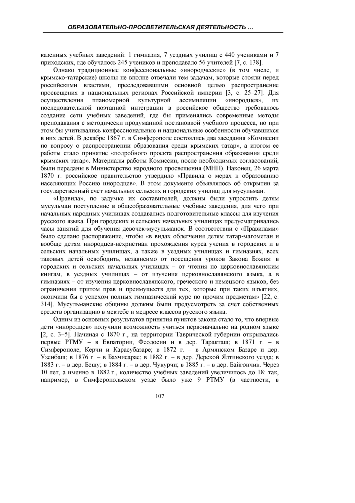 Вопросы возникновения и функционирования учебных заведений для «инородческого населения» в Российской империи в целом и для крымско-татарской молодежи в частности рассматривались ранее в публикациях Абибуллаевой Д. И. [1], Анохиной И. А. [2], Бакировой А. М. [3], Бешерова П., Жуковской Т. Н. [4], Ганкевича В. Ю. [5; 6], Ореховой Л. О. [7; 8], Прохорова Д. А. [9-12], Рашитова Ф. А., Ишмухамедовой Р. И. [13], Редькиной Л. И., Шушары Т. В., Глузмана А. В., Яксы Н. В. [14-18], Саматовой Ч. Х. [19], Хабутдинова А. Ю. [20] и ряда других авторов.