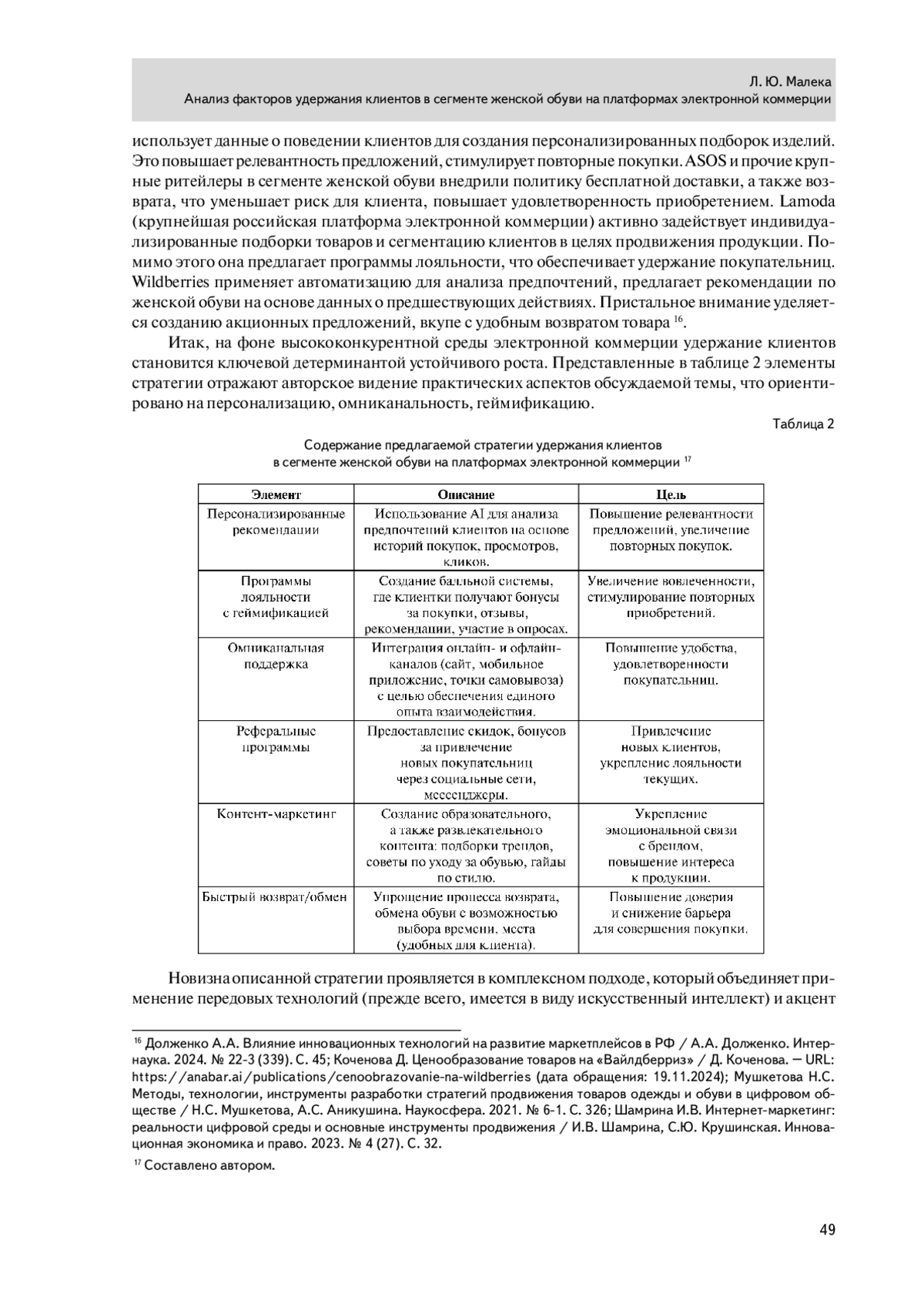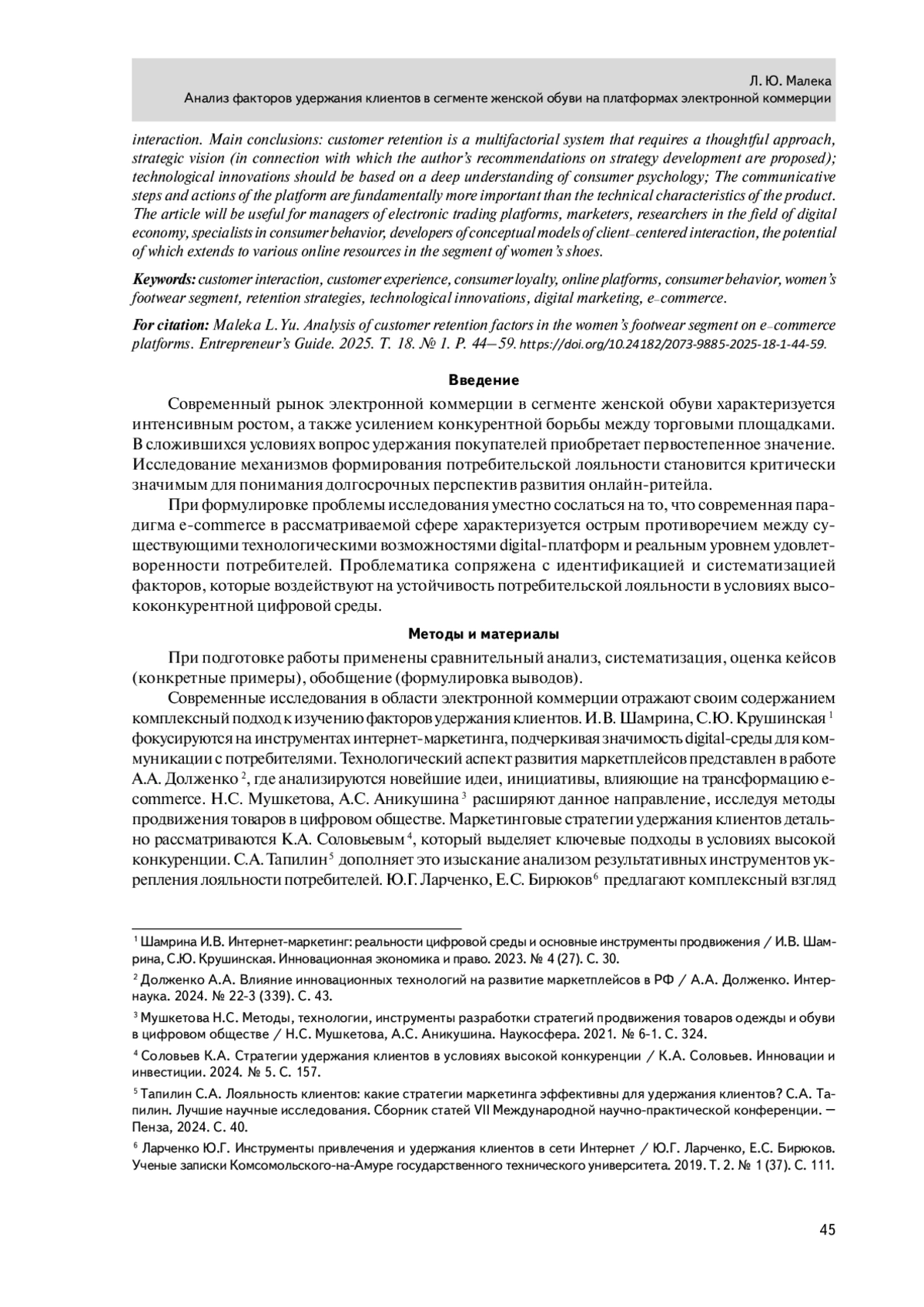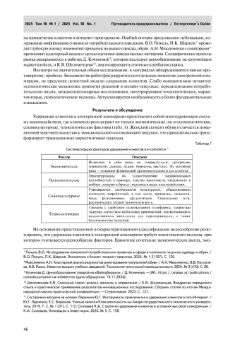 В статье систематизированы и проанализированы факторы, которые влияют на удержание клиентов в сегменте женской обуви на платформах электронной коммерции. Актуальность темы детерминирована трансформационными процессами в этой сфере, характеризующимися перманентной модификацией потребительских стратегий, а также необходимостью разработки инновационных подходов к клиентскому взаимодействию. Проблематика фокусируется на комплексном анализе концептуальных основ, идентификации системообразующих условий, определяющих лояльность в цифровом экономическом пространстве. В ходе исследования выявлены основные противоречия между: технологическими возможностями платформ и реальными потребностями покупателей; массовыми маркетинговыми стратегиями и запросом на индивидуализацию; информационной избыточностью и качеством коммуникативного взаимодействия. Основные выводы: удержание клиентов — многофакторная система, требующая продуманного подхода, стратегического видения (в связи с чем предложены авторские рекомендации относительно выработки стратегии); технологические инновации должны базироваться на глубоком понимании психологии потребителя; коммуникативные шаги и действия платформы принципиально важнее технических характеристик товара. Статья будет полезна руководителям электронных торговых площадок, маркетологам, исследователям в области цифровой экономики, специалистам по потребительскому поведению, разработчикам концептуальных моделей клиентоцентричного взаимодействия, потенциал которых распространяется на различные онлайн-ресурсы в сегменте женской обуви.