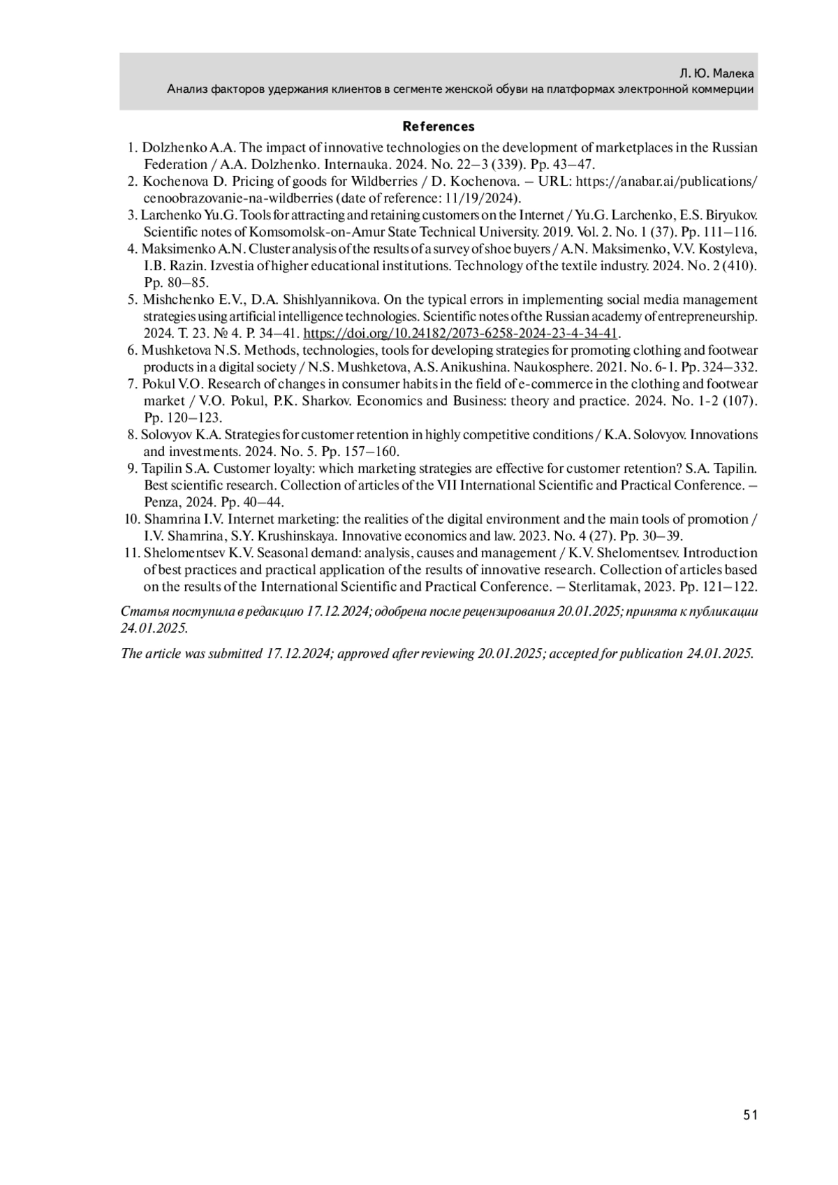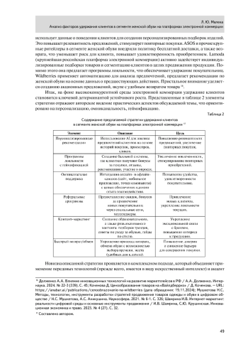 1. Долженко А.А. Влияние инновационных технологий на развитие маркетплейсов в РФ / А.А. Долженко. Интернаука. 2024. № 223 (339). С. 43-47.