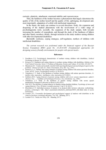 1. Дьячкова Е.С. Психологические особенности матерей, воспитывающих детей с ОВЗ и инвалидностью / Е.С. Дьячкова, Т.В. Баяндина // Медицинская психология в России. - 2021. - №3. - С. 1-7. EDN: ZCLFSR