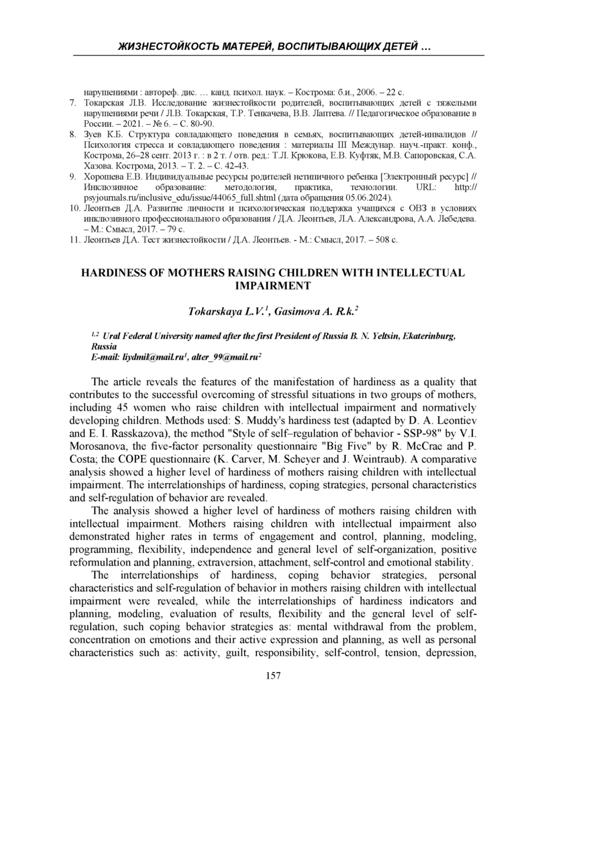 5. Токарская Л.В. Исследование жизнестойкости матерей, воспитывающих детей с расстройствами аутистического спектра // Токарская Л.В., Трубицына А.Н., Бутакова Е.С., Джултаева А.С. // 3i: intellect, idea, innovation - интеллект, идея, инновация. - 2021. - № 4. - С. 33-44. EDN: QLERIQ
