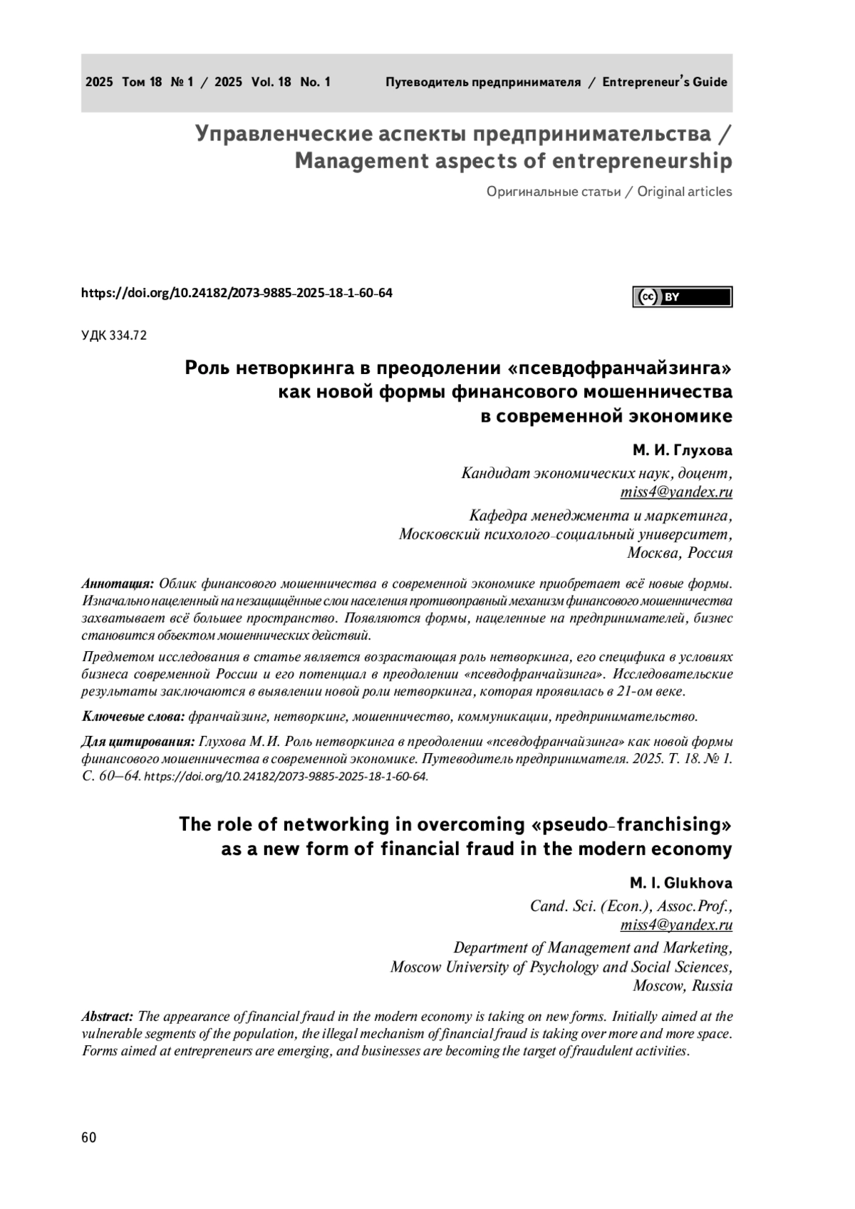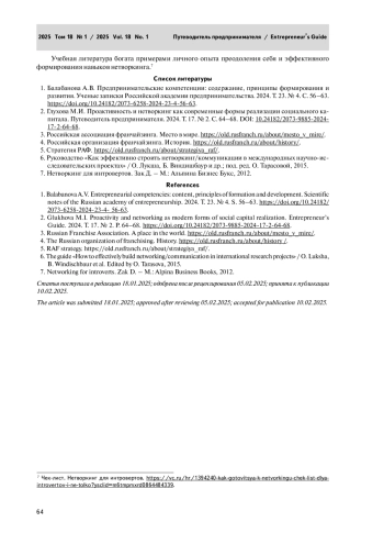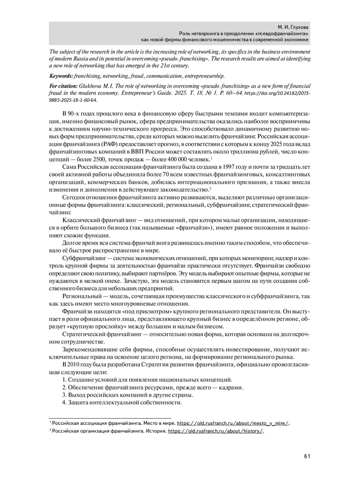 ГЛУХОВА М. И. РОЛЬ НЕТВОРКИНГА В ПРЕОДОЛЕНИИ «ПСЕВДОФРАНЧАЙЗИНГА» КАК НОВОЙ ФОРМЫ ФИНАНСОВОГО МОШЕННИЧЕСТВА В СОВРЕМЕННОЙ ЭКОНОМИКЕ // РОССИЙСКАЯ АКАДЕМИЯ ПРЕДПРИНИМАТЕЛЬСТВА. 2025. Т. 18, № 1