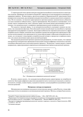 В статье рассматривается специфика цифровых технологий в контексте развития торговой отрасли, в частности розницы. Делается акцент на том, что в условиях цифровизации рынок розничной торговли претерпел существенные изменения, перестроив свои методы и подходы на новые технологичные пути. В теоретической части работы описываются различные подходы к пониманию сущности конкурентоспособности в условиях цифровизации.