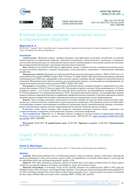 Цель. Провести систематический анализ современных данных о влиянии третьих моляров на различные аспекты качества жизни пациентов с оценкой медицинских, психологических, социальных и экономических факторов воздействия.