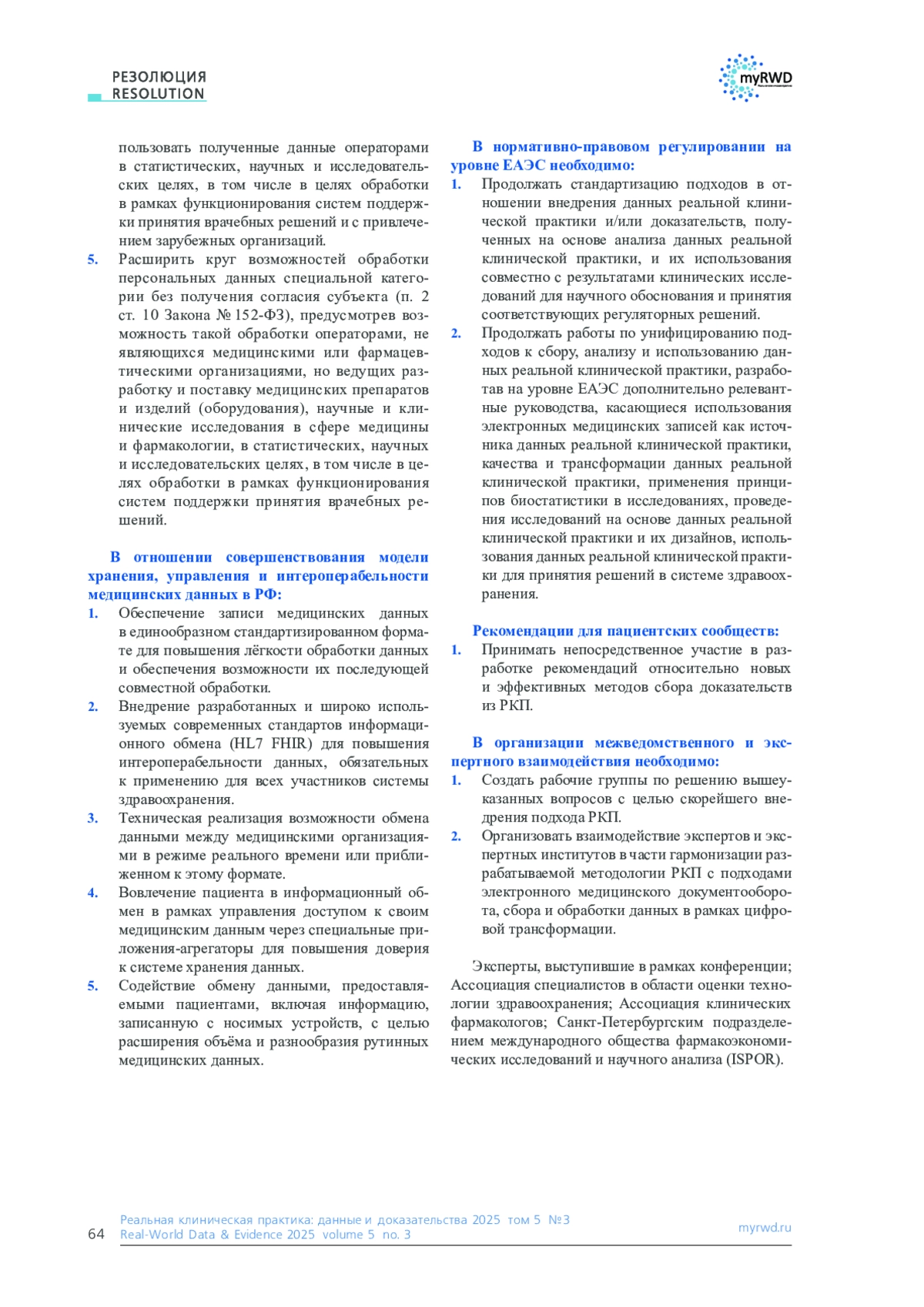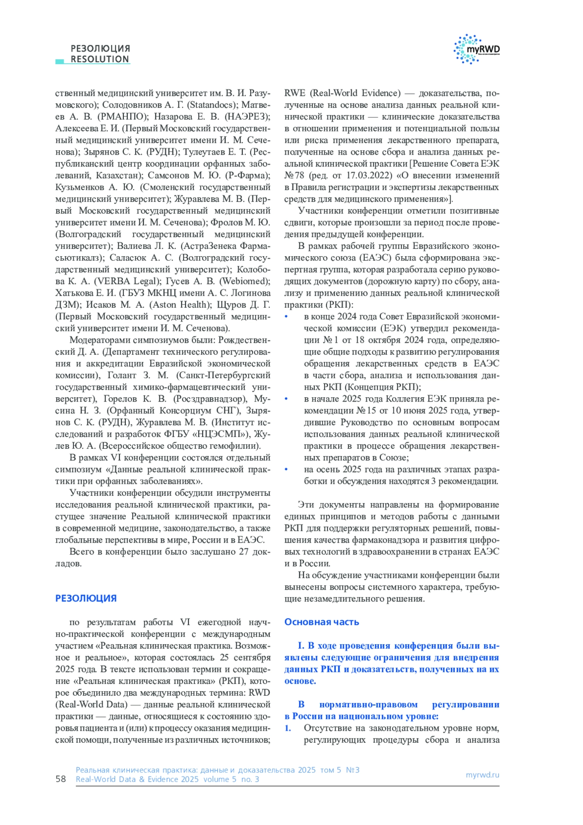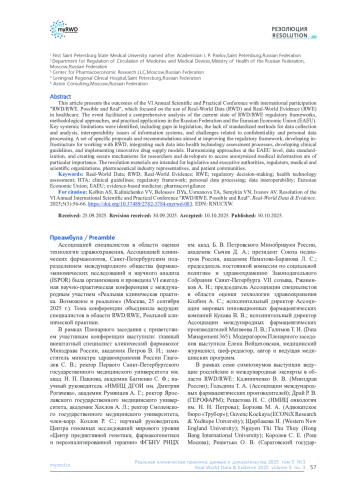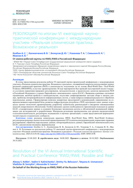 В статье представлены результаты работы VI ежегодной научно-практической конференции с международным участием «Реальная клиническая практика. Возможное и реальное», посвящённой вопросам использования данных реальной клинической практики (РКП) и доказательств, полученных на их основе (Real-World Data / Real-World Evidence; RWD/RWE), в системе здравоохранения. В ходе мероприятия был проведён всесторонний анализ текущего состояния нормативно-правового регулирования, методологических и практических аспектов применения РКП в Российской Федерации и странах Евразийского экономического союза (ЕАЭС). Выявлены ключевые системные ограничения, включая пробелы в законодательстве, отсутствие унифицированных методик сбора и анализа данных, проблемы интероперабельности информационных систем, а также вопросы конфиденциальности и обработки персональных данных. Сформулирован комплекс конкретных предложений и рекомендаций, направленных на совершенствование нормативной базы, развитие инфраструктуры для работы с РКП, интеграцию таких данных в процессы оценки технологий здравоохранения, разработку клинических рекомендаций и внедрение инновационных моделей лекарственного обеспечения. Особое внимание уделено необходимости гармонизации подходов на уровне ЕАЭС, стандартизации данных и созданию безопасных механизмов доступа к обезличенной медицинской информации для исследователей и разработчиков. Материалы резолюции предназначены для органов законодательной и исполнительной власти, регуляторов, медицинских и научных организаций, а также представителей фармацевтической отрасли и пациентских сообществ.