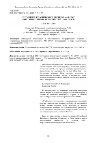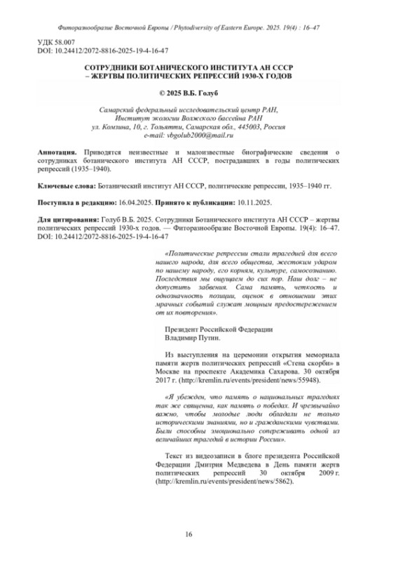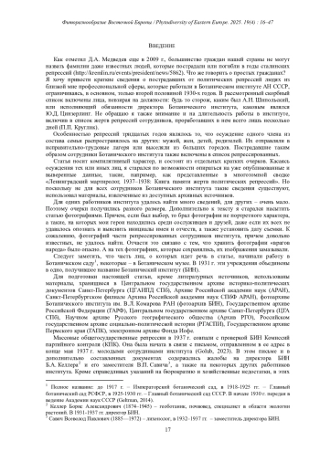 Как отметил Д. А. Медведев еще в 2009 г., большинство граждан нашей страны не могут назвать фамилии даже известных людей, которые пострадали или погибли в годы сталинских репрессий (http://kremlin. ru/events/president/news/5862). Что же говорить о простых гражданах? Я хочу привести краткие сведения о пострадавших от политических репрессий людях из близкой мне профессиональной сферы, которые работали в Ботаническом институте АН СССР, ограничиваясь, в основном, только второй половиной 1930-х годов. В рассмотренный скорбный список включены лица, невзирая на должности: будь то сторож, каким был А. И. Шипольский, или исполняющий обязанности директора Ботанического института, каковым являлся Ю. Д. Цинзерлинг. Не обращаю я также внимание и на длительность работы в институте, включив в список жертв репрессий сотрудников, проработавших в нем всего лишь несколько дней (П. П. Круглик).