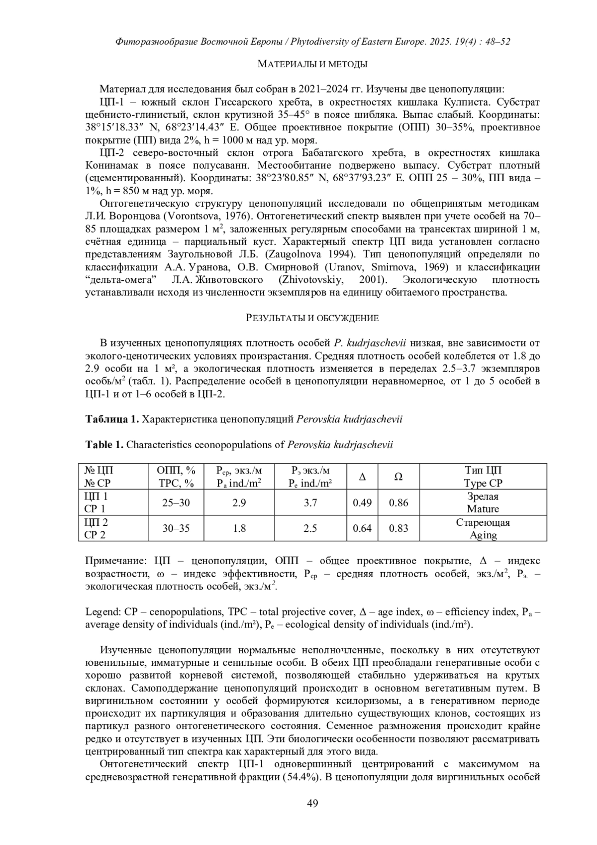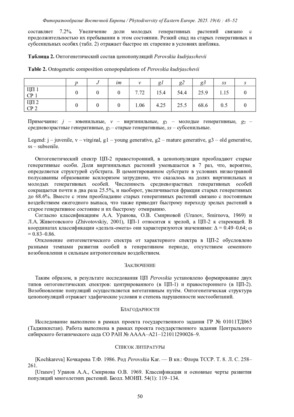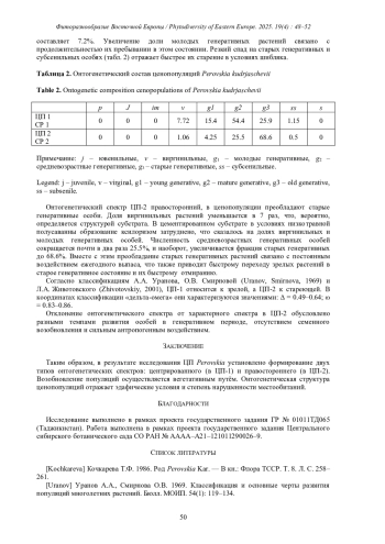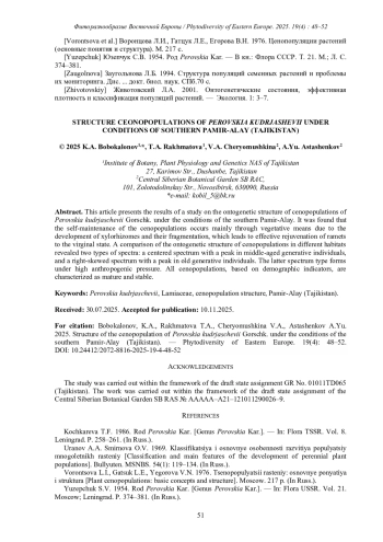В статье приводятся результаты изучения онтогенетической структуры ценопопуляций Perovskia kudrjaschevii Gorschk. в условиях Южного Памиро-Алая. Установлено, что самоподдержание ценопопуляций происходит в основном вегетативным путем за счет развития ксилоризом и их партикуляции, что приводит к эффективному омоложению рамет до виргинильного состояния. При сравнении онтогенетической структуры ценопопуляций в разных условиях обитания выявлено две типа спектра: центрированный с пиком на средневозрастных генеративных особях и правосторонний с пиком на старых генеративных. Последний тип спектра формируется при высокой антропогенной нагрузке. Все ценопопуляции по демографическим показателям характеризуются как зрелые, стабильные.