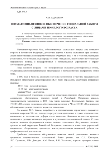 Нормативно-правовая база, обеспечивающая социальную защиту лиц пожилого возраста в Российской Федерации, достаточно широка. Система социальных прав пожилых людей заложена еще Конституцией Российской Федерации 1993 г. 41-й статьей Конституции установлено, что пожилые люди наряду со всеми гражданами, имеют право на бесплатную медицинскую помощь в государственных и муниципальных учреждениях и охрану собственного здоровья