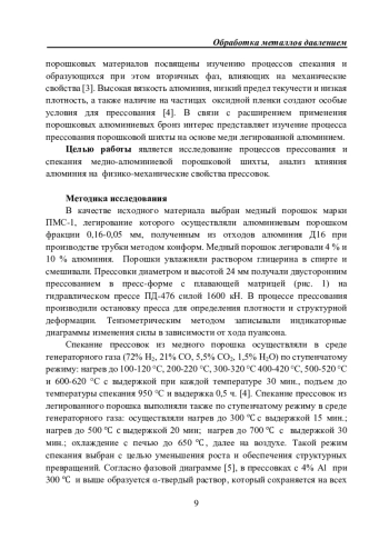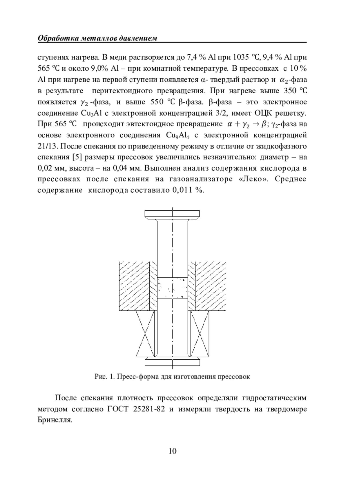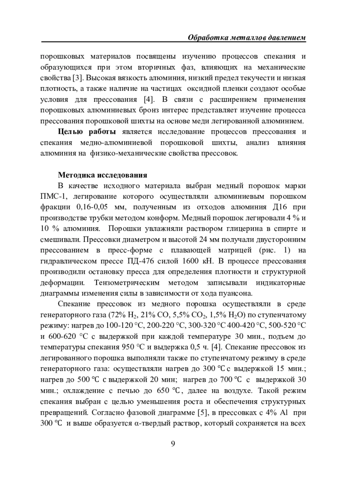В статье представлены результаты прессования и спекания порошковых сплавов на основе меди легированных алюминием. Показано, что на процесс прессования порошковой шихты на основе меди влияет химический состав. С увеличением концентрации алюминия в шихте сила прессования уменьшается. Плотность прессовок уменьшается за счет увеличения структурной деформации, причем у порошковой меди более интенсивно. При большей величине структурной деформации плотность прессовок, содержащих 10 % алюминия меньше, что связано с наличием оксидной пленки на поверхности частиц алюминия, которая препятствует сращиванию частиц.