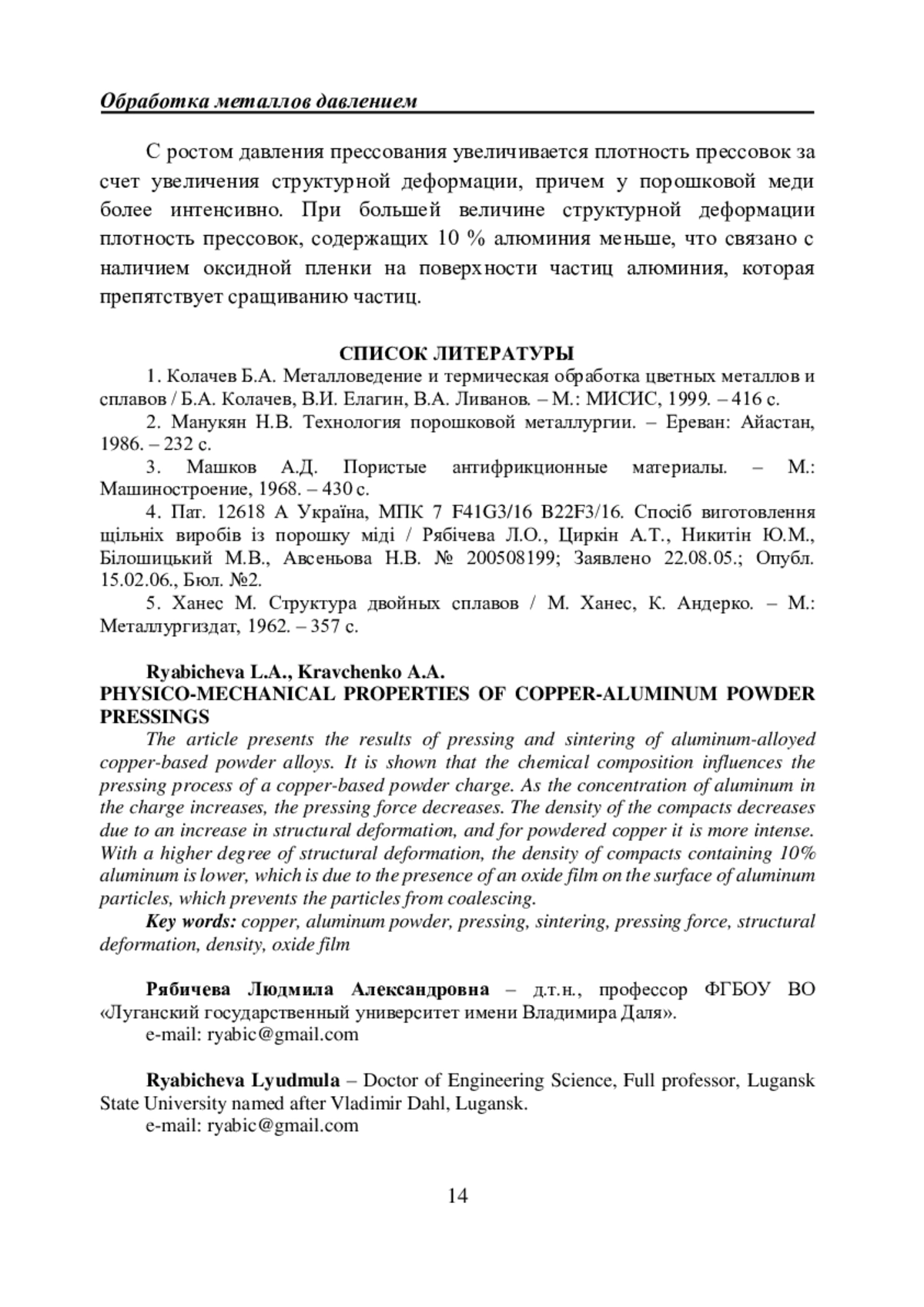 4. Пат. 12618 А Україна, МПК 7 F41G3/16 B22F3/16. Спосiб виготовлення щiльнiх виробiв iз порошку мiдi / Рябiчева Л.О., Циркiн А.Т., Никитiн Ю.М., Бiлошицький М.В., Авсеньова Н.В. № 200508199 Заявлено 22.08.05. Опубл. 15.02.06., Бюл. №2.