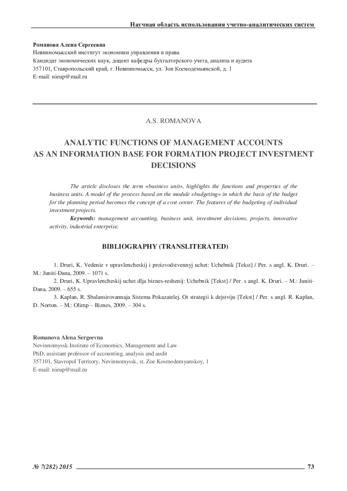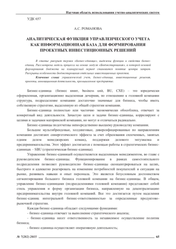 РОМАНОВА А. С. АНАЛИТИЧЕСКАЯ ФУНКЦИЯ УПРАВЛЕНЧЕСКОГО УЧЕТА КАК ИНФОРМАЦИОННАЯ БАЗА ДЛЯ ФОРМИРОВАНИЯ ПРОЕКТНЫХ ИНВЕСТИЦИОННЫХ РЕШЕНИЙ // ЭКОНОМИЧЕСКИЕ И ГУМАНИТАРНЫЕ НАУКИ. 2015. № 7 (282)