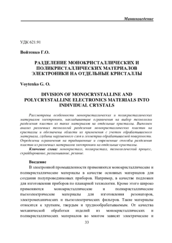 Рассмотрены особенности монокристаллических и поликристаллических материалов электроники, накладывающие ограничения на выбор технологии разделения пластин из таких материалов на отдельные кристаллы. Выполнен анализ различных технологий разделения монокристаллических пластин на кристаллы и обозначены области их применения с учетом обрабатываемого материала, глубины нарушенного слоя и геометрии обрабатываемой поверхности. Определены ограничения на традиционные и современные способы разделения пластин из различных материалов электроники на отдельные кристаллы.