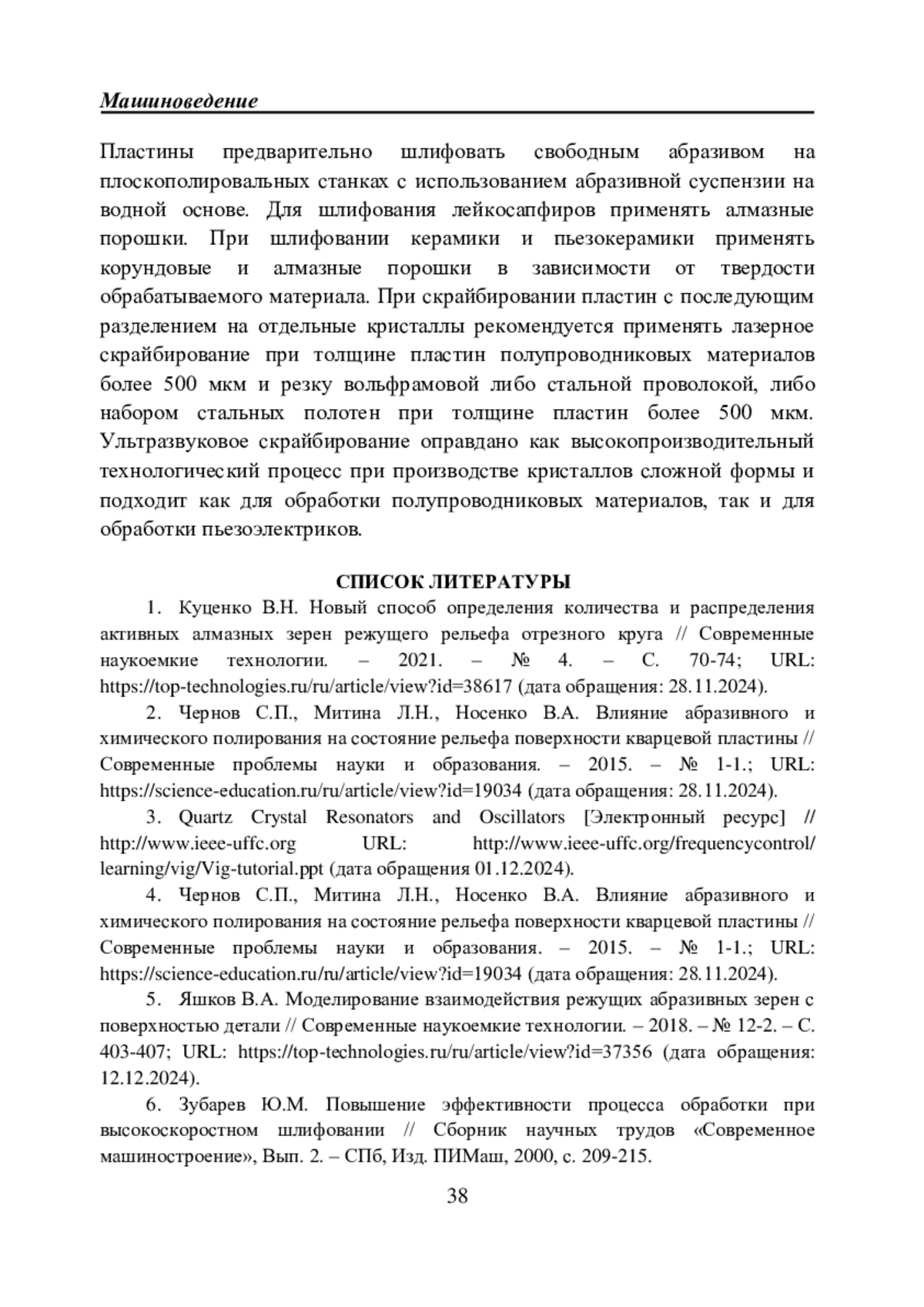 4. Чернов С.П., Митина Л.Н., Носенко В.А. Влияние абразивного и химического полирования на состояние рельефа поверхности кварцевой пластины // Современные проблемы науки и образования. - 2015. - № 1-1. URL:https://scienceeducation.ru/ru/article/view?id19034(дата обращения: 28.11.2024).