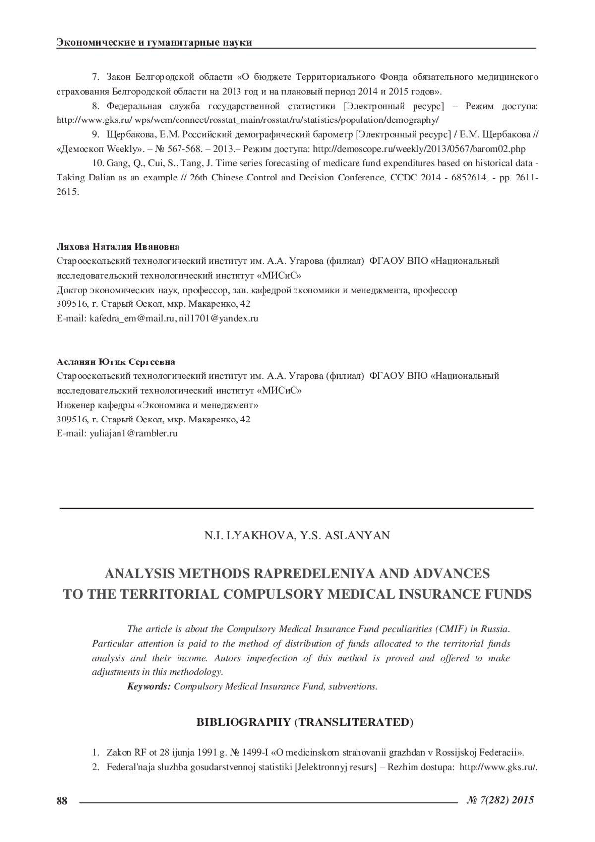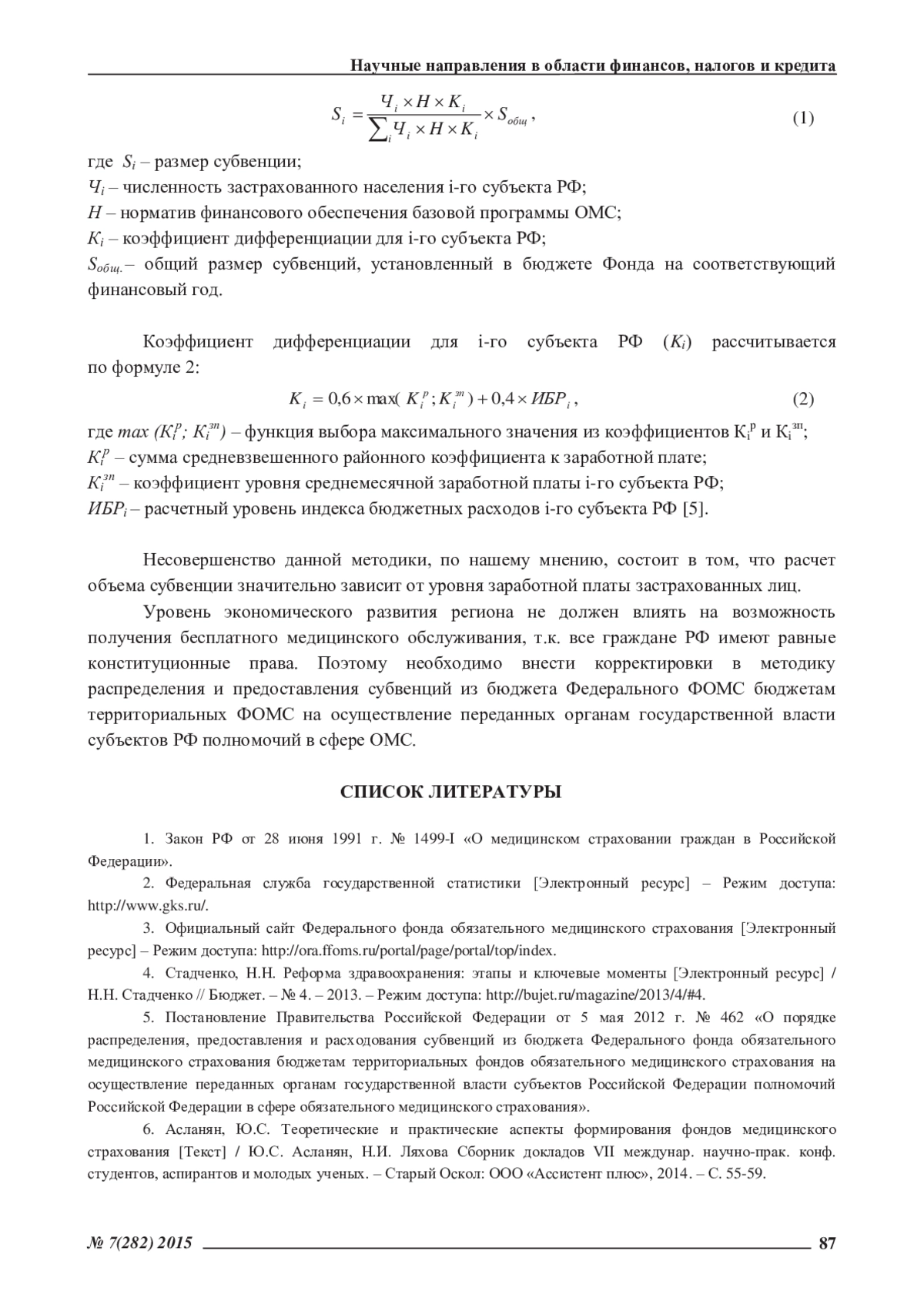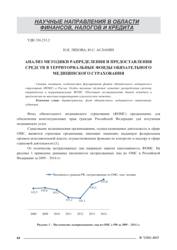 ЛЯХОВА Н. И., АСЛАНЯН Ю. С. АНАЛИЗ МЕТОДИКИ РАПРЕДЕЛЕНИЯ И ПРЕДОСТАВЛЕНИЯ СРЕДСТВ В ТЕРРИТОРИАЛЬНЫЕ ФОНДЫ ОБЯЗАТЕЛЬНОГО МЕДИЦИНСКОГО СТРАХОВАНИЯ // ЭКОНОМИЧЕСКИЕ И ГУМАНИТАРНЫЕ НАУКИ. 2015. № 7 (282)
