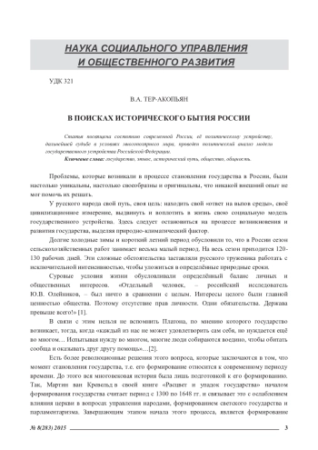 У русского народа свой путь, своя цель: находить свой «ответ на вызов среды», своё цивилизационное измерение, выдвинуть и воплотить в жизнь свою социальную модель государственного устройства. Здесь следует остановиться на процессе возникновения и развития государства, выделяя природно-климатический фактор