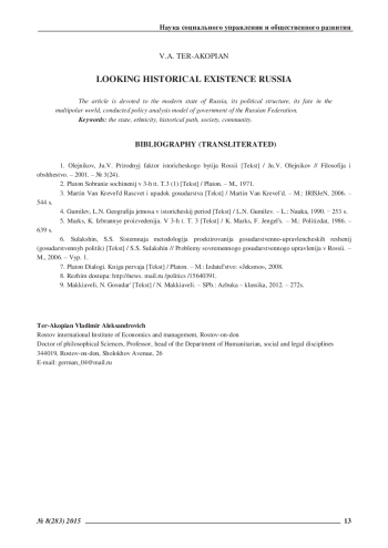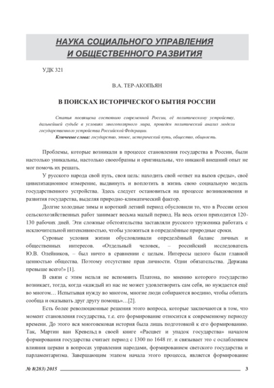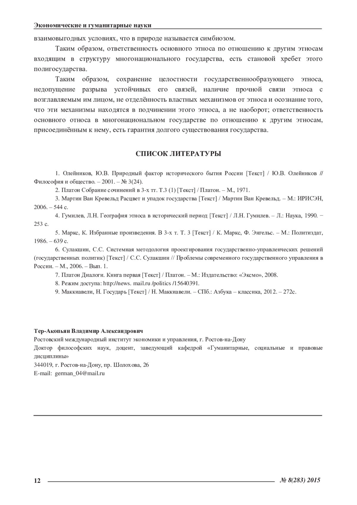 1. Олейников, Ю.В. Природный фактор исторического бытия России [Текст] / Ю.В. Олейников // Философия и общество. - 2001. - № 3(24). EDN: VLKJOT