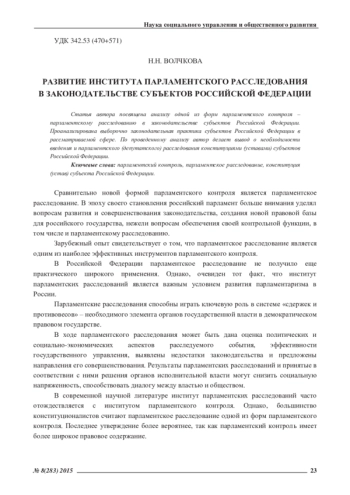 Статья автора посвящена анализу одной из форм парламентского контроля – парламентскому расследованию в законодательстве субъектов Российской Федерации. Проанализирована выборочно законодательная практика субъектов Российской Федерации в рассматриваемой сфере. По проведенному анализу автор делает вывод о необходимости введения и парламентского (депутатского) расследования конституциями (уставами) субъектов Российской Федерации