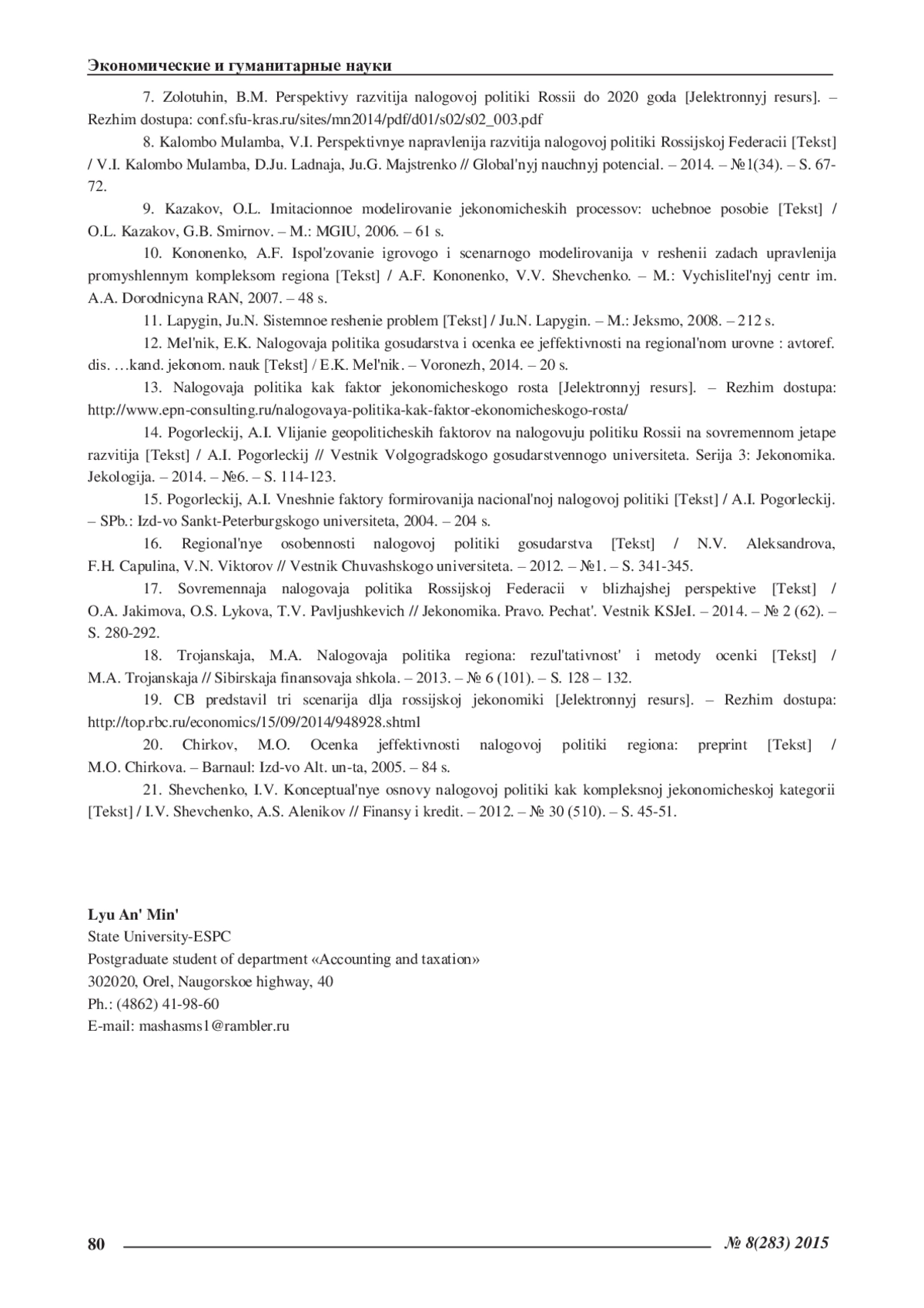 ЛЫУ А. М. МОДЕЛИРОВАНИЕ НАЛОГОВОЙ ПОЛИТИКИ В СОВРЕМЕННЫХ ЭКОНОМИЧЕСКИХ И ПОЛИТИЧЕСКИХ УСЛОВИЯХ // ЭКОНОМИЧЕСКИЕ И ГУМАНИТАРНЫЕ НАУКИ. 2015. № 8 (283)