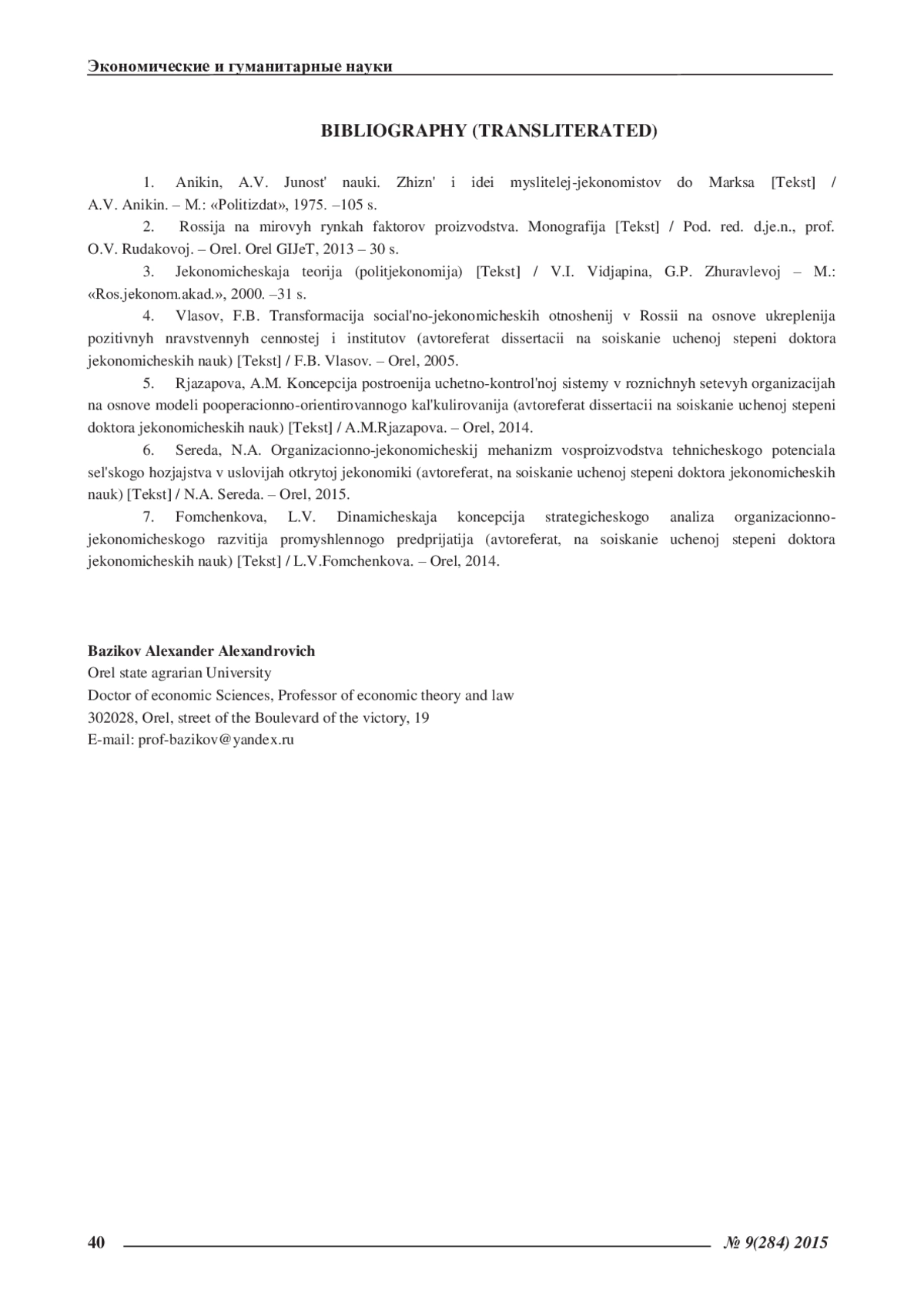 4. Власов, Ф.Б. Трансформация социально-экономических отношений в России на основе укрепления позитивных нравственных ценностей и институтов (автореферат диссертации на соискание ученой степени доктора экономических наук) [Текст] / Ф.Б. Власов. - Орел, 2005. EDN: ZNCPWR