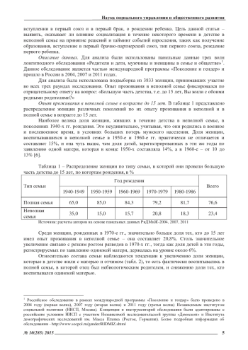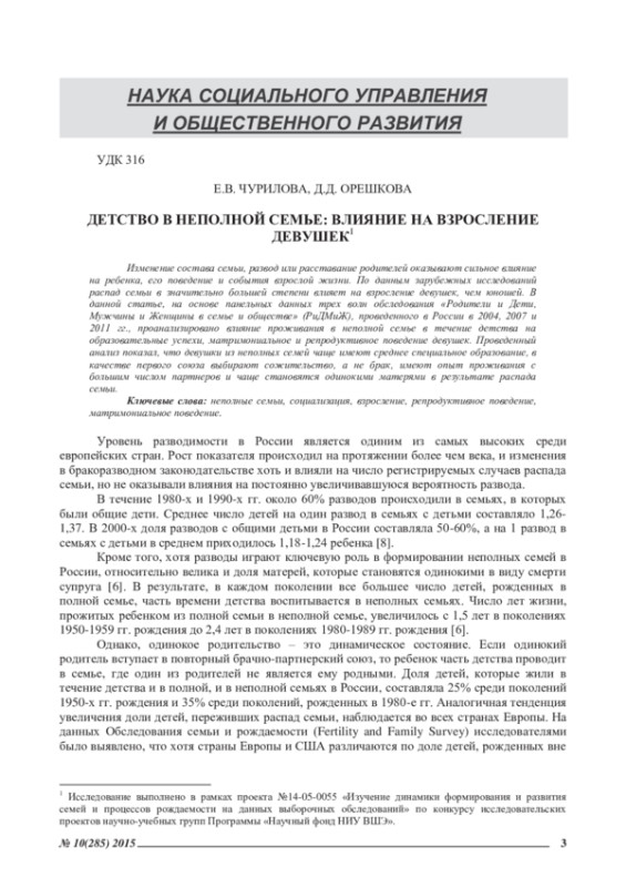 Изменение состава семьи, развод или расставание родителей оказывают сильное влияние на ребенка, его поведение и события взрослой жизни. По данным зарубежных исследований распад семьи в значительно большей степени влияет на взросление девушек, чем юношей. В данной статье, на основе панельных данных трех волн обследования «Родители и Дети, Мужчины и Женщины в семье и обществе» (РиДМиЖ), проведенного в России в 2004, 2007 и 2011 гг., проанализировано влияние проживания в неполной семье в течение детства на образовательные успехи, матримониальное и репродуктивное поведение девушек. Проведенный анализ показал, что девушки из неполных семей чаще имеют среднее специальное образование, в качестве первого союза выбирают сожительство, а не брак, имеют опыт проживания с большим числом партнеров и чаще становятся одинокими матерями в результате распада семьи