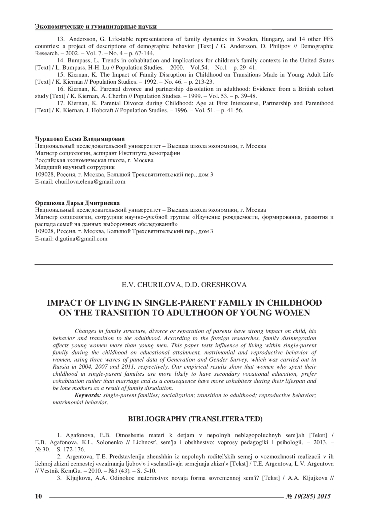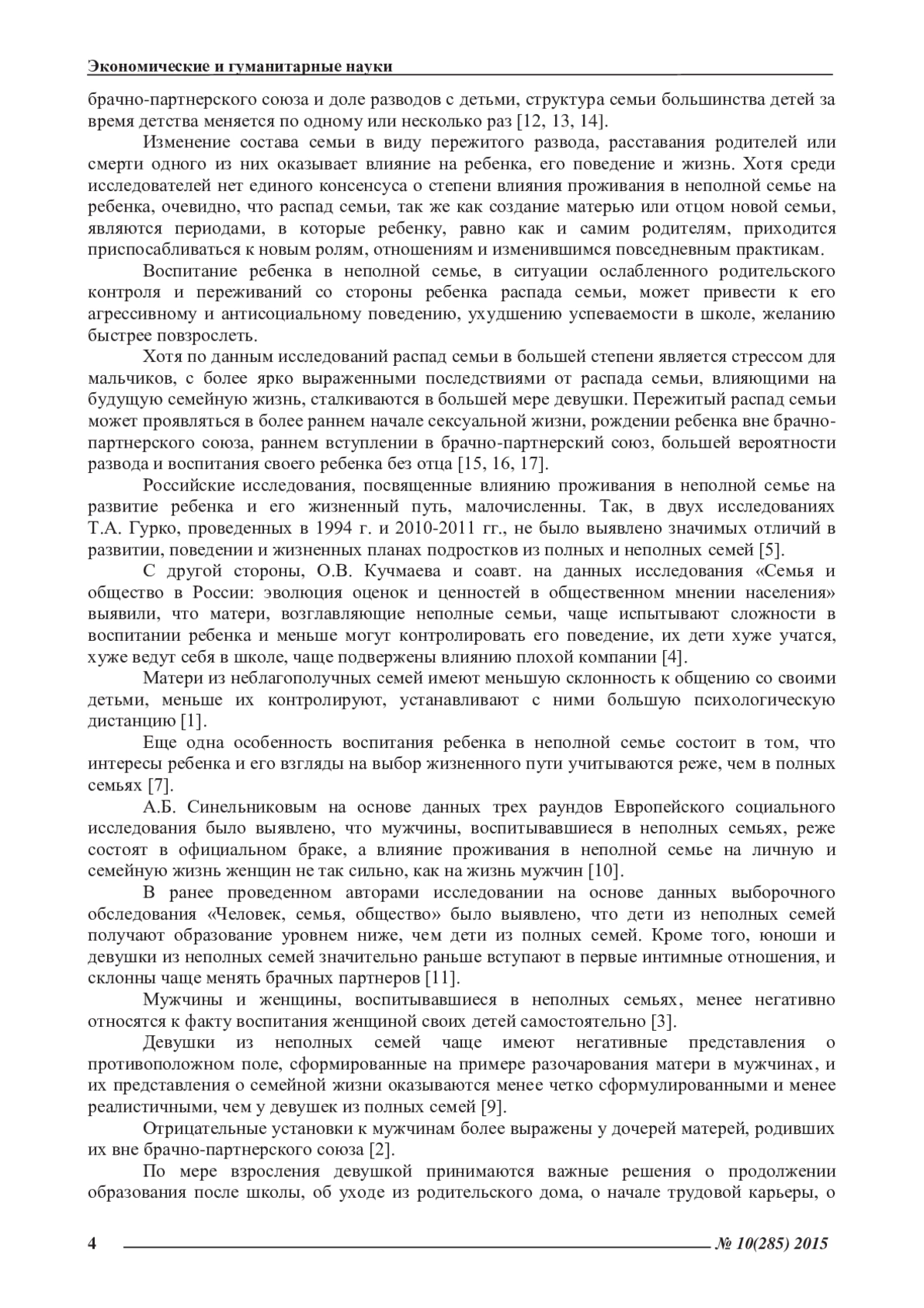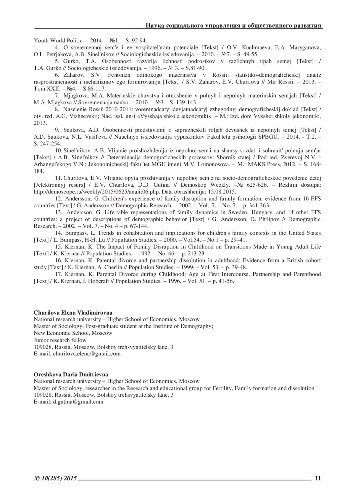 11. Чурилова, Е.В. Влияние опыта проживания в неполной семье на социо-демографическое поведение детей [Электронный ресурс] / Е.В. Чурилова, Д.Д. Гутина // Демоскоп Weekly. -№ 625-626. - Режим доступа: http://demoscope.ru/weekly/2015/0625/analit06.php. Дата обращения: 15.08.2015.