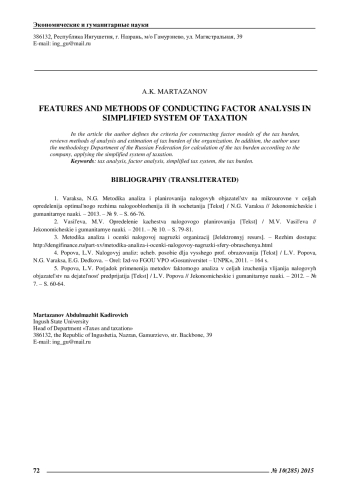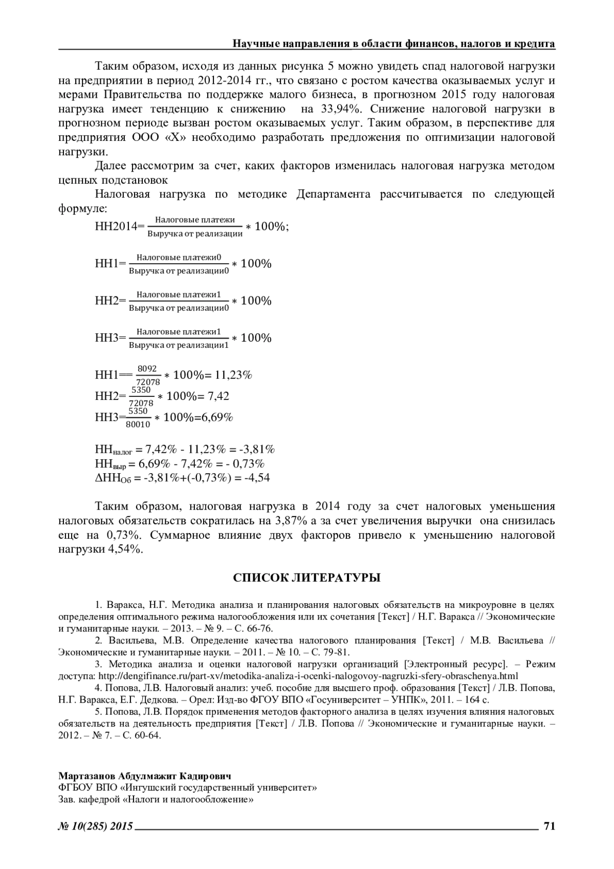 5. Попова, Л.В. Порядок применения методов факторного анализа в целях изучения влияния налоговых обязательств на деятельность предприятия [Текст] / Л.В. Попова // Экономические и гуманитарные науки. - 2012. - № 7. - С. 60-64. EDN: OZEHGX
