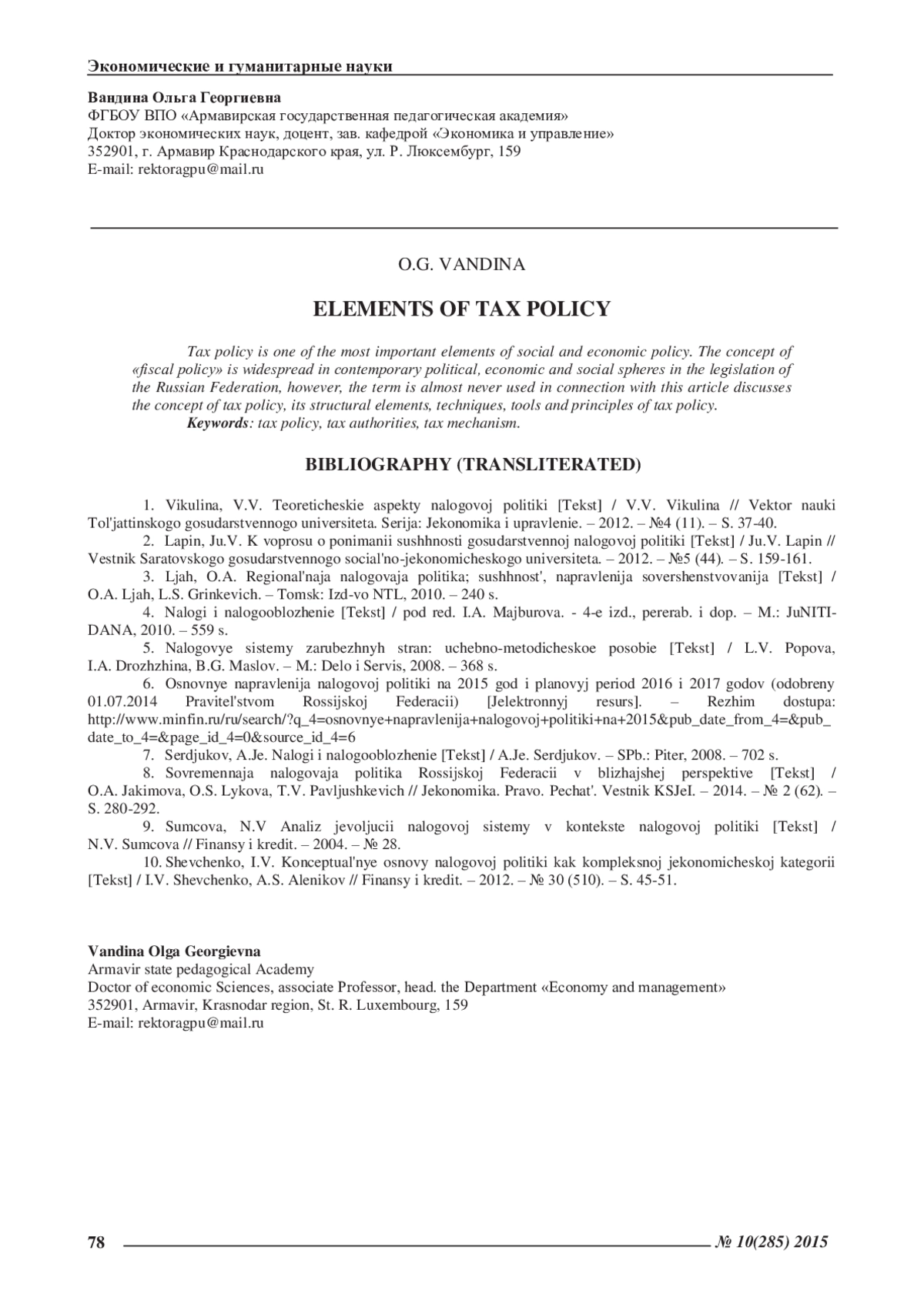 1. Викулина, В.В. Теоретические аспекты налоговой политики [Текст] / В.В. Викулина // Вектор науки Тольяттинского государственного университета. Серия: Экономика и управление. - 2012. - №4 (11). - С. 37-40. EDN: PULDTL