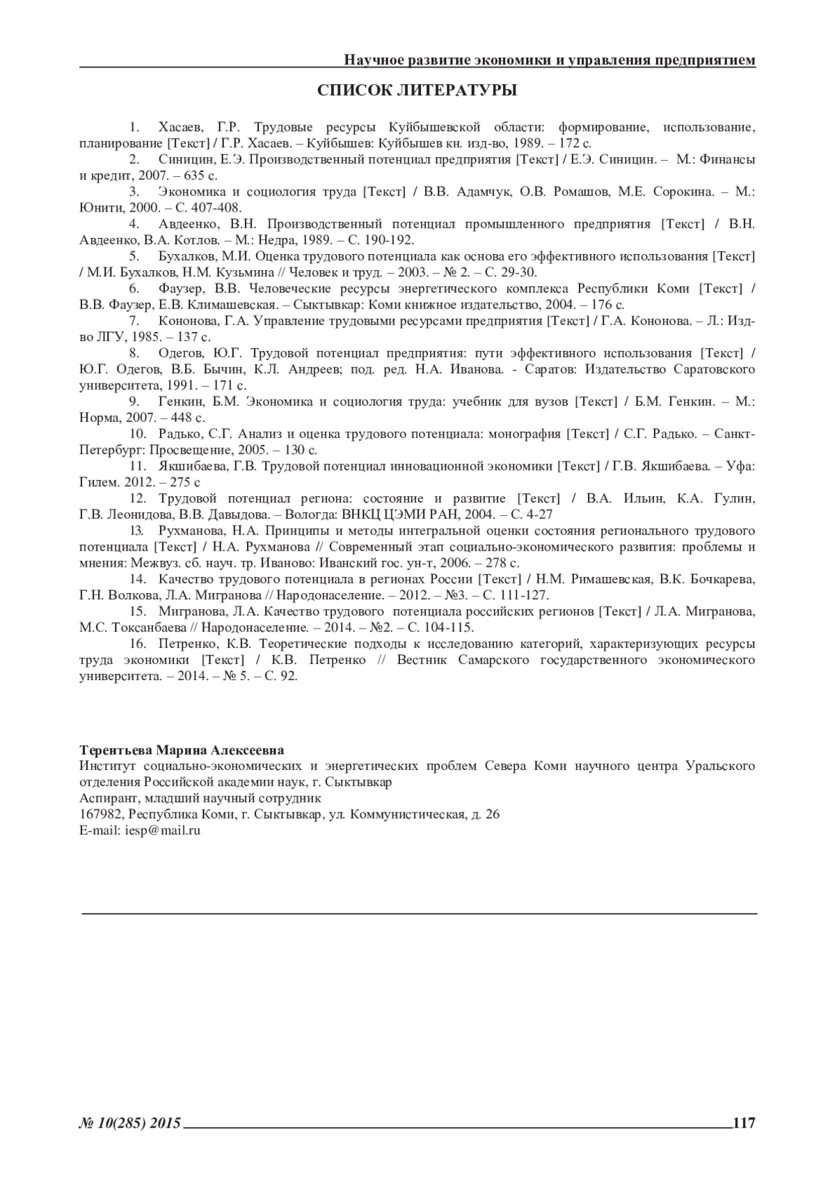 16. Петренко, К.В. Теоретические подходы к исследованию категорий, характеризующих ресурсы труда экономики [Текст] / К.В. Петренко // Вестник Самарского государственного экономического университета. - 2014. - № 5. - С. 92. EDN: SIJZGD