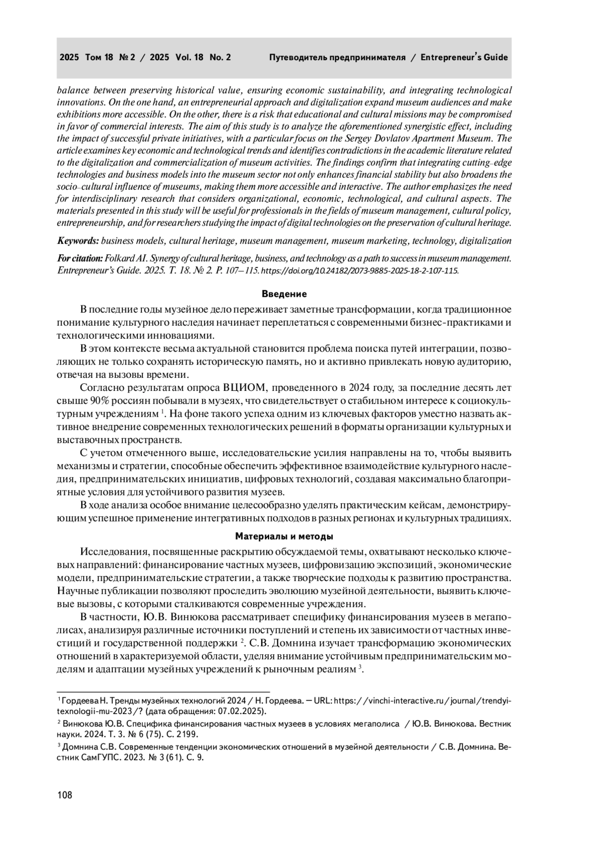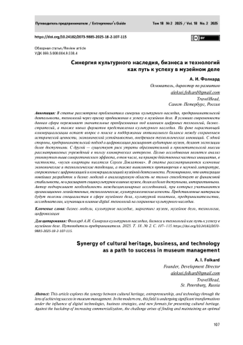 В статье рассмотрена проблематика синергии культурного наследия, предпринимательской деятельности, технологий через призму продвижения к успеху в музейном деле. В условиях современности данная сфера переживает значительные преобразования под влиянием цифровых технологий, бизнес–стратегий, а также новых форматов представления культурного наследия. На фоне нарастающей коммерциализации встает вопрос о поиске и поддержании оптимального баланса между сохранением исторической ценности, экономической устойчивостью, внедрением технологических инноваций. С одной стороны, предпринимательский подход и цифровизация расширяют аудиторию музеев, делают экспозиции более доступными. С другой — существует риск утраты образовательной и просветительской миссии рассматриваемых учреждений в пользу коммерческих интересов.