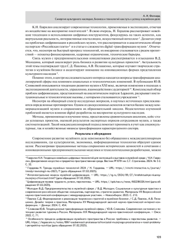 2. Гаврилин К.Н. Тенденции новейших цифровых технологий для экспозиций и выставок в музейной среде / К.Н. Гаврилин. Декоративное искусство и предметнопространственная среда. Вестник РГХПУ им. С.Г. Строганова. 2024. № 32. С. 32-36.