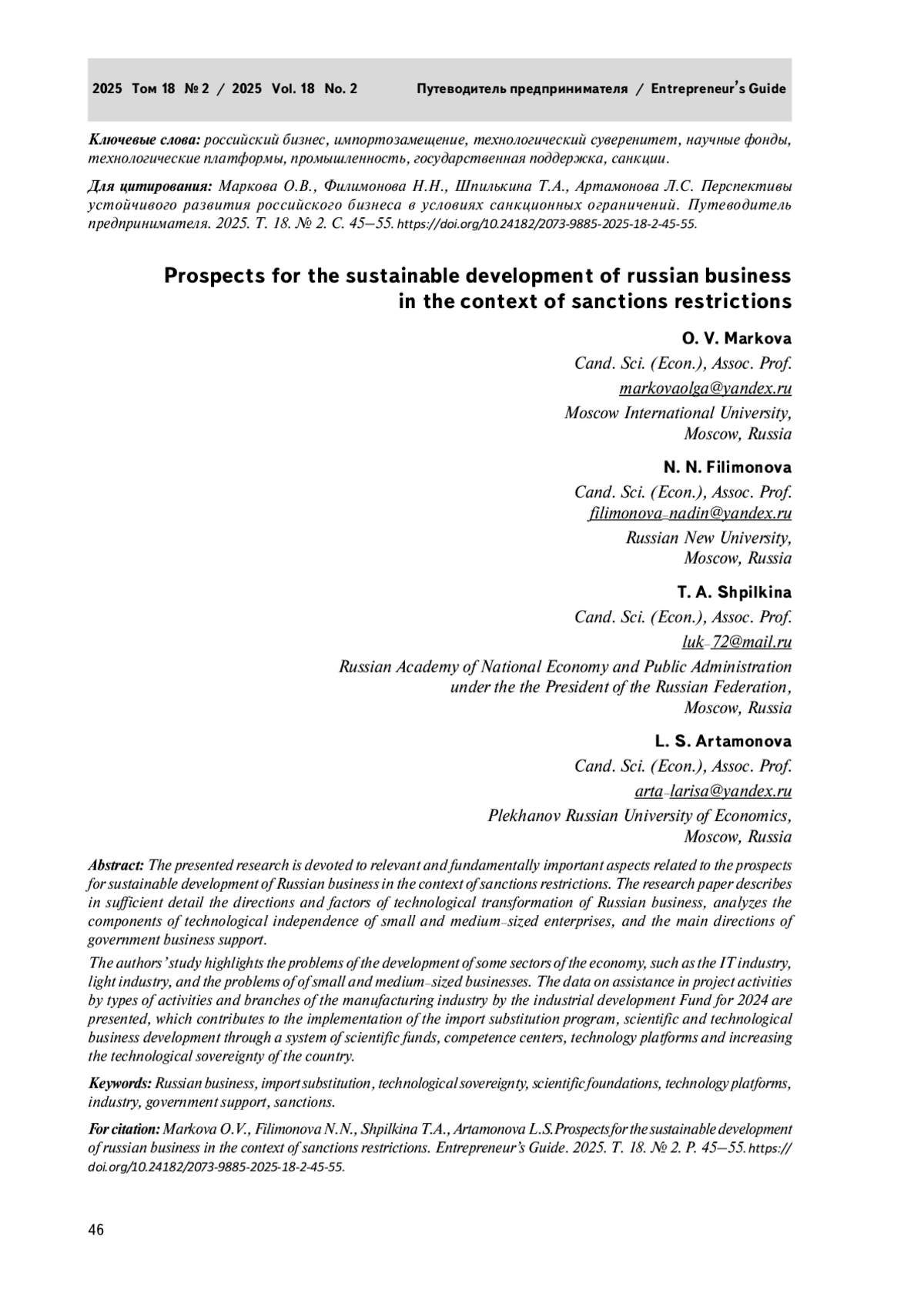 11. Шпилькина Т.А., Филимонова Н.Н., Артамонова Л.С., Шишова И.А. Тенденции развития отраслей и секторов экономики России в условиях санкций, импортозамещения и концепции устойчивого развития. Ученые записки Российской Академии предпринимательства. 2022. Т. 21, № 3. С. 68-76.