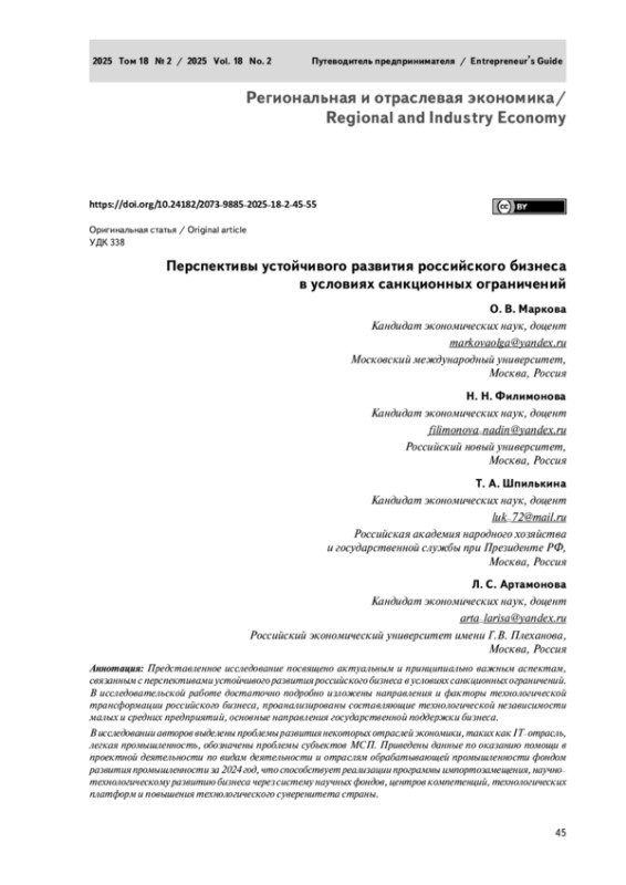 Представленное исследование посвящено актуальным и принципиально важным аспектам, связанным с перспективами устойчивого развития российского бизнеса в условиях санкционных ограничений. В исследовательской работе достаточно подробно изложены направления и факторы технологической трансформации российского бизнеса, проанализированы составляющие технологической независимости малых и средних предприятий, основные направления государственной поддержки бизнеса. В исследовании авторов выделены проблемы развития некоторых отраслей экономики, таких как IT–отрасль, легкая промышленность, обозначены проблемы субъектов МСП. Приведены данные по оказанию помощи в проектной деятельности по видам деятельности и отраслям обрабатывающей промышленности фондом развития промышленности за 2024 год, что способствует реализации программы импортозамещения, научно–технологическому развитию бизнеса через систему научных фондов, центров компетенций, технологических платформ и повышения технологического суверенитета страны.
