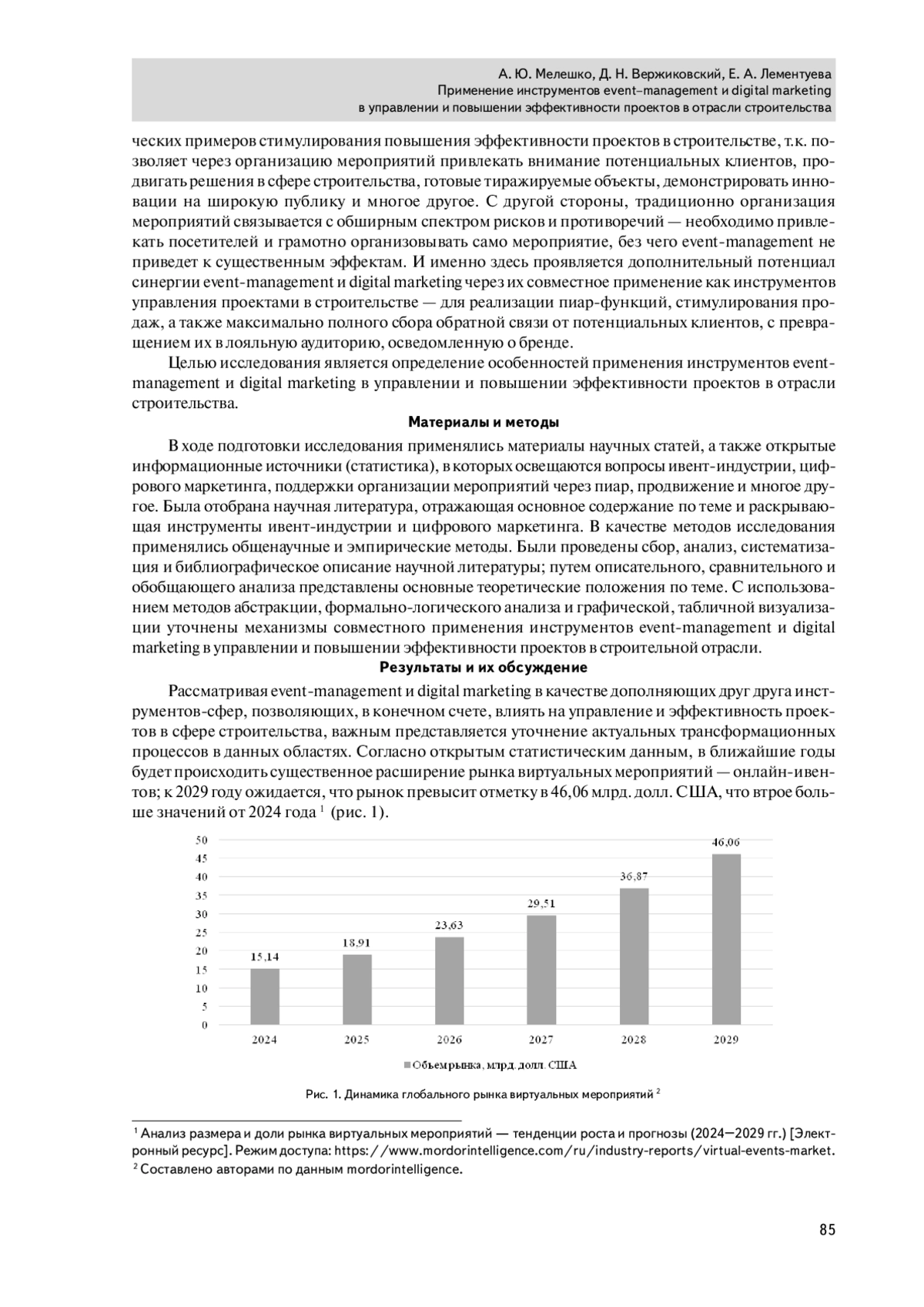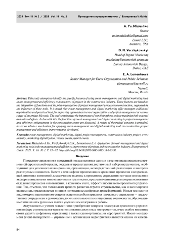 В исследовании предпринята попытка определения особенностей применения инструментов event–management и digital marketing в управлении и повышении эффективности проектов в отрасли строительства. Основу таких особенностей составляет соединение функций и совместная организация процессов управления проектами в строительной отрасли. Отмечается, что event–management и digital marketing предоставляют управляющему дополнительные возможности и прикладные инструменты совершенствования подходов к организации мероприятий, к управлению проектами на разных стадиях жизненного цикла. Внимание уделено идеям совместного применения инструментов для максимизации доступных внешних и внутренних эффектов. В соответствии с данным обстоятельством раскрываются функции event–management и digital marketing в управлении и повышении эффективности проектов в строительной отрасли. Приводится обзор теоретических положений, на основании синтеза которых вырабатывается механизм применения инструментов event–management и digital marketing в управлении и повышении эффективности проектов в строительстве.