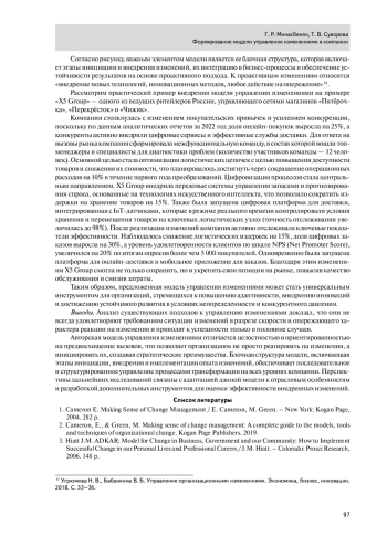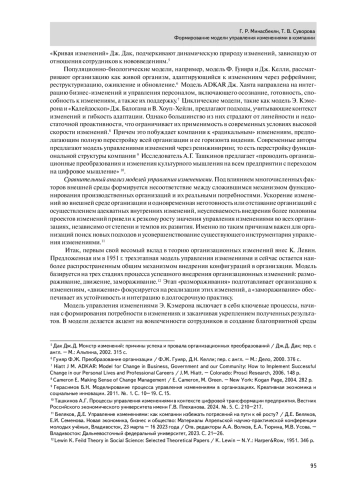1. Cameron E. Making Sense of Change Management / E. Cameron, M. Green. - New York: Kogan Page, 2004. 282 р. 2. Cameron, E., & Green, M. Making sense of change management: A complete guide to the models, tools and techniques of organizational change. Kogan Page Publishers. 2019. 3. Hiatt J. M. ADKAR: Model for Change in Business, Government and our Community: How to Implement Successful Change in our Personal Lives and Professional Careers / J. M. Hiatt. - Colorado: Prosci Research, 2006. 148 p. 4. Lewin K. Feild Theory in Social Science: Selected Theoretical Papers / K. Lewin. - N. Y.: Harper & Row, 1951. 346 p. 5. Pryor M. G. et al. Challenges facing change management theories and research. Delhi business review. 2008. Vol. 9. №. 1. P. 1-20. 6. Адизес И. Управляя изменениями / И. Адизес: [пер. с англ. В. Кузин]. - СПб.: Питер, 2010. 223 с. 7. Беляков, Д. Е. Управление изменениями: как компании избежать потрясений на пути к её росту? / Д. Е. Беляков, Е. И. Семенова. Новая экономика, бизнес и общество: Материалы Апрельской научнопрактической конференции молодых учёных, Владивосток, 23 марта - 16 2023 года / Отв. редакторы А. А. Волков, Е. А. Тюрина, М. В. Усова. - Владивосток: Дальневосточный федеральный университет, 2023. С. 21-26. 8. Виханский О. Менеджмент: Учебник / О. Виханский, А. Наумов. - М.: Экономистъ, 4е изд., 2006. 612 с. 9. Герасимов Б. Н. Моделирование процесса управления изменениями в организациях. Креативная экономика и социальные инновации. 2011. №. 1. С. 10-19. 10. Гуияр Ф. Ж. Преобразование организации / Ф. Ж. Гуияр, Д. Н. Келли; пер. с англ. - М.: Дело, 2000. 376 с. 11. Дак Дж. Д. Монстр изменений: причины успеха и провала организационных преобразований / Дж. Д. Дак; пер. с англ. - М.: Альпина, 2002. 315 с. 12. Журнал Коммерсант. Статистика по количеству действующих коммерческих организаций. - Режим доступа: URL: https://www. kommersant. ru/doc/6452636. (Дата обращения 17. 03. 2025). Текст: электронный. 13. Коттер Дж. Впереди изменений / Дж. Коттер: [пер. с англ.]. - М.: ЗАО «Олимп-Бизнес», 2011. 256 с. 14. Ташкинов А. Г. Процессы управления изменениями в контексте цифровой трансформации предприятия. Вестник Российского экономического университета имени Г. В. Плеханова. 2024. №. 5. С. 210-217. 15. Угрюмова Н. В., Бабанкина В. Б. Управление организационными изменениями. Экономика, бизнес, инновации. 2018. С. 33-36.