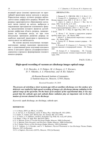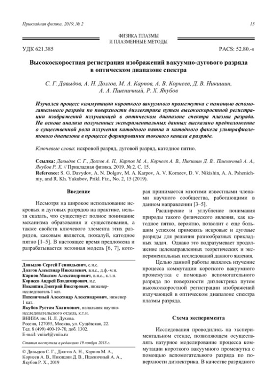 ДАВЫДОВ С. Г., ДОЛГОВ А. Н., КАРПОВ М. А., КОРНЕЕВ А. В., НИКИШИН Д. В., ПШЕНИЧНЫЙ А. А., ЯКУБОВ Р. Х. ВЫСОКОСКОРОСТНАЯ РЕГИСТРАЦИЯ ИЗОБРАЖЕНИЙ ВАКУУМНО-ДУГОВОГО РАЗРЯДА В ОПТИЧЕСКОМ ДИАПАЗОНЕ СПЕКТРА // ПРИКЛАДНАЯ ФИЗИКА. 2019. №2