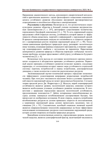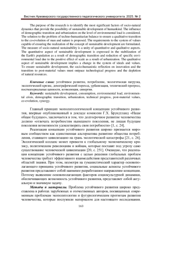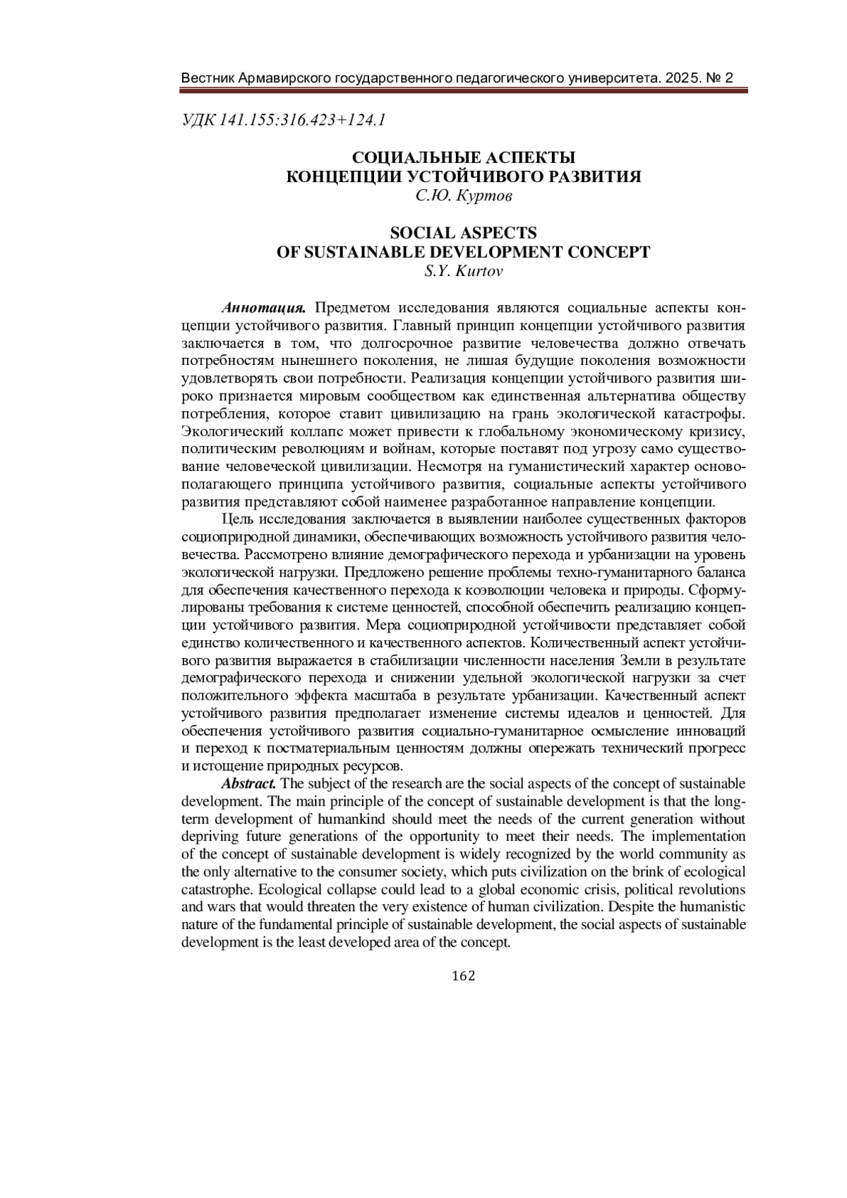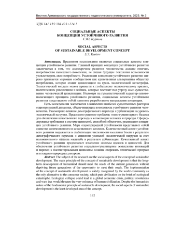 Предметом исследования являются социальные аспекты концепции устойчивого развития. Главный принцип концепции устойчивого развития заключается в том, что долгосрочное развитие человечества должно отвечать потребностям нынешнего поколения, не лишая будущие поколения возможности удовлетворять свои потребности. Реализация концепции устойчивого развития широко признается мировым сообществом как единственная альтернатива обществу потребления, которое ставит цивилизацию на грань экологической катастрофы. Экологический коллапс может привести к глобальному экономическому кризису, политическим революциям и войнам, которые поставят под угрозу само существование человеческой цивилизации. Несмотря на гуманистический характер основополагающего принципа устойчивого развития, социальные аспекты устойчивого развития представляют собой наименее разработанное направление концепции. Цель исследования заключается в выявлении наиболее существенных факторов социоприродной динамики, обеспечивающих возможность устойчивого развития человечества. Рассмотрено влияние демографического перехода и урбанизации на уровень экологической нагрузки. Предложено решение проблемы техно-гуманитарного баланса для обеспечения качественного перехода к коэволюции человека и природы. Сформулированы требования к системе ценностей, способной обеспечить реализацию концепции устойчивого развития. Мера социоприродной устойчивости представляет собой единство количественного и качественного аспектов. Количественный аспект устойчивого развития выражается в стабилизации численности населения Земли в результате демографического перехода и снижении удельной экологической нагрузки за счет положительного эффекта масштаба в результате урбанизации. Качественный аспект устойчивого развития предполагает изменение системы идеалов и ценностей. Для обеспечения устойчивого развития социально-гуманитарное осмысление инноваций и переход к постматериальным ценностям должны опережать технический прогресс и истощение природных ресурсов.