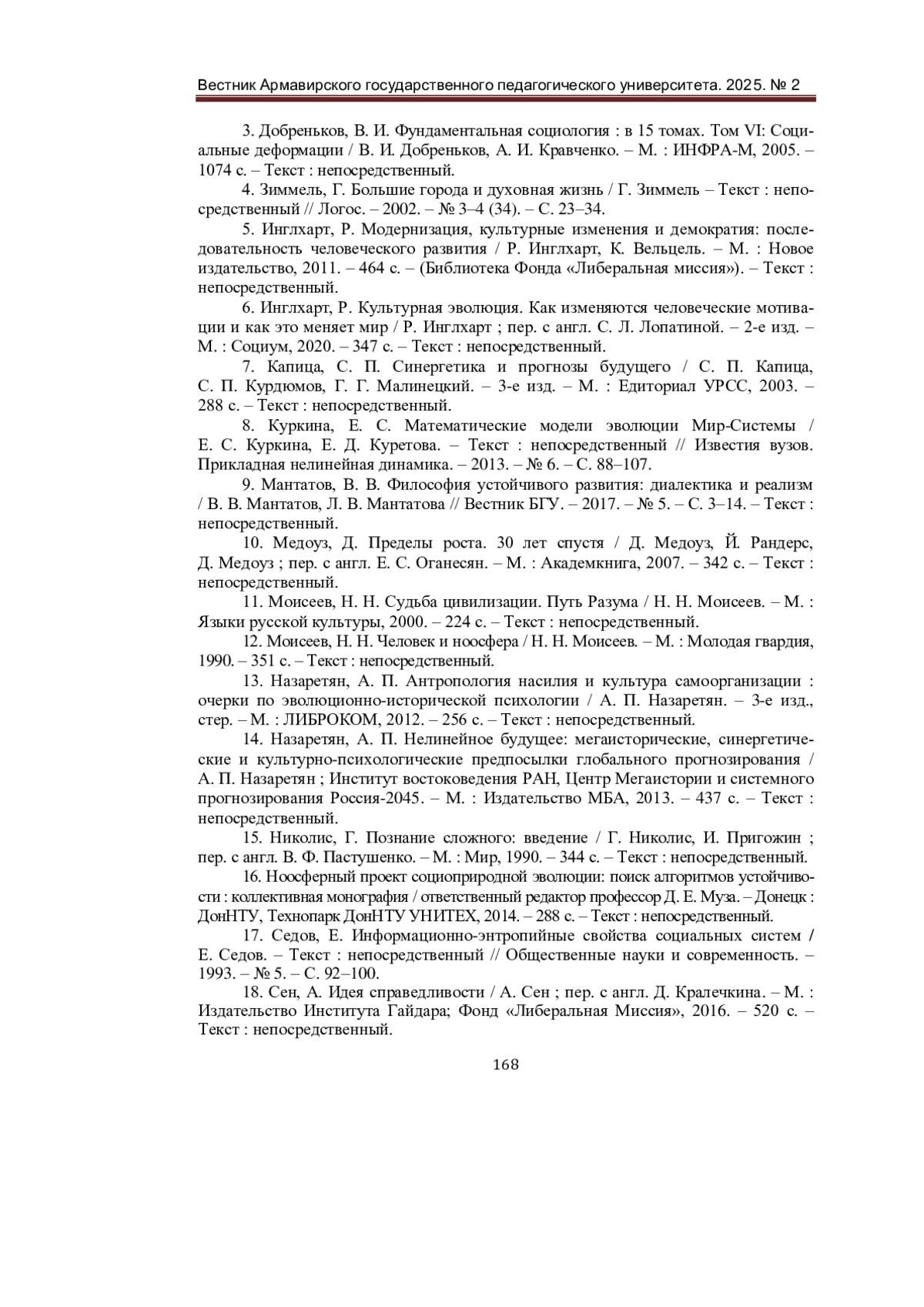 17. Седов, Е. Информационно-энтропийные свойства социальных систем / Е. Седов. - Текст: непосредственный // Общественные науки и современность. - 1993. - № 5. - С. 92-100.