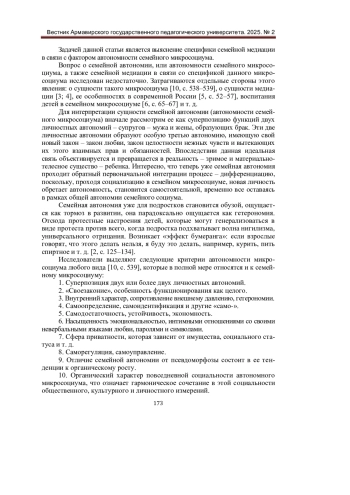 В статье эксплицируется социально-философский аспект в изучении семейной медиации. Для этого используется концепт «автономность семейного микросоциума». Тем самым изучение микросоциума в эпистемологическом поле смещается из области социологии в сторону социальной философии. Проводится мысль о том, что благодаря своей автономности семья остается традиционным устойчивым социокультурным институтом, который имеет свои собственные закономерности функционирования и развития. Семейная автономия имеет ценностный характер, в основе ее лежит ценностно-смысловая нравственная реальность брака, предполагающая конфликтные ситуации в основном на почве так называемого «несходства характеров». К различным признакам семейной автономии предлагается добавить признак необходимости специфической медиации, которая сохраняет целостность семейного микросоциума, его автономность. В то же время подчеркивается важность формы медиации, направленной на регулирования баланса личностных автономий в семье. Подчеркивается значимость диалога личностей в процессе семейной медиации, поскольку диалог формирует автономию семейного микросоциума.