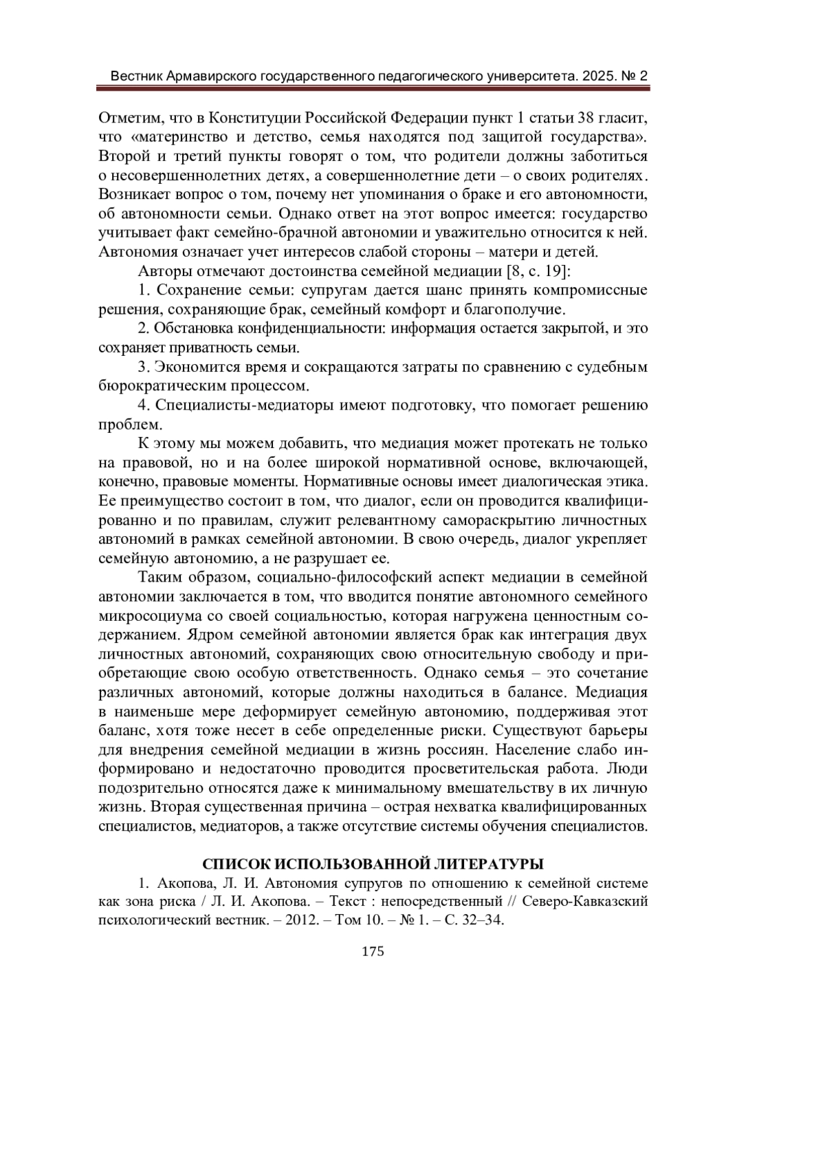 1. Акопова, Л. И. Автономия супругов по отношению к семейной системе как зона риска / Л. И. Акопова. - Текст: непосредственный // Северо-Кавказский психологический вестник. - 2012. - Том 10. - № 1. - С. 32-34. EDN: RCQIGP