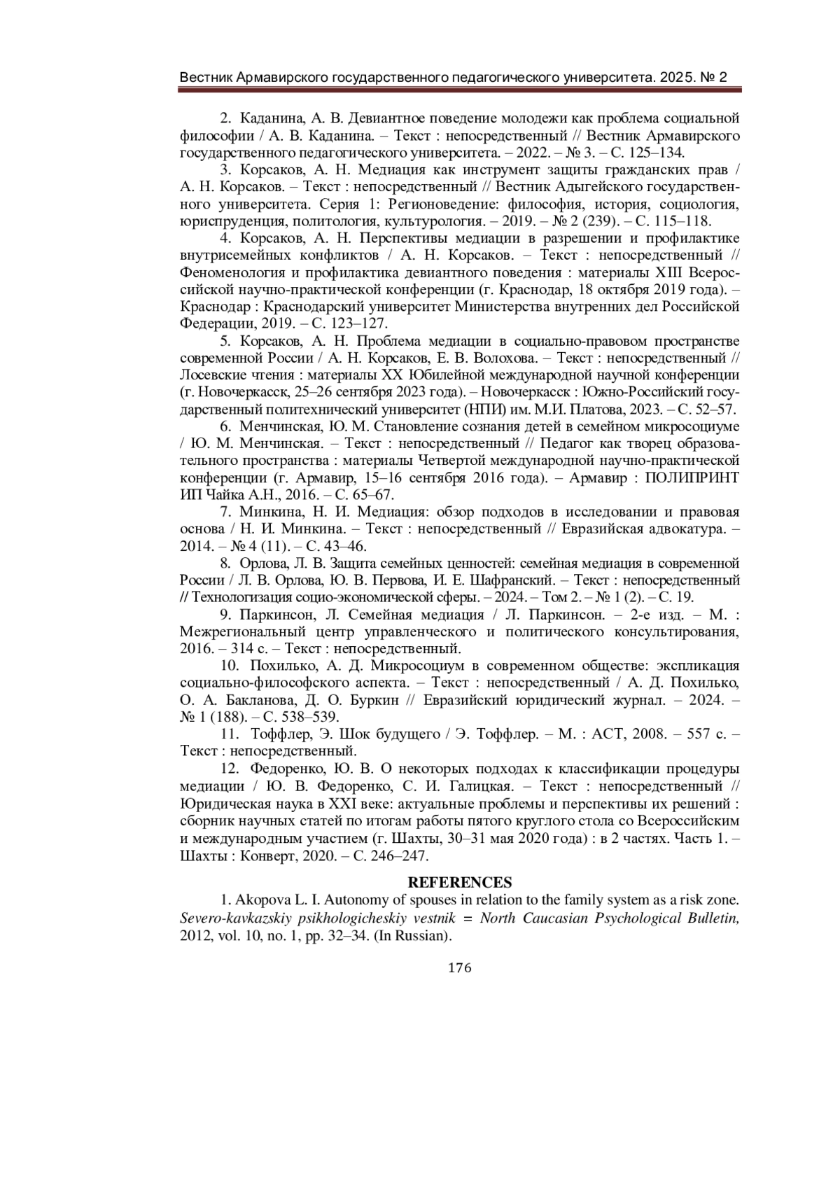 4. Корсаков, А. Н. Перспективы медиации в разрешении и профилактике внутрисемейных конфликтов / А. Н. Корсаков. - Текст: непосредственный // Феноменология и профилактика девиантного поведения: материалы XIII Всероссийской научно-практической конференции (г. Краснодар, 18 октября 2019 года). - Краснодар: Краснодарский университет Министерства внутренних дел Российской Федерации, 2019. - С. 123-127. EDN: TSTQCR